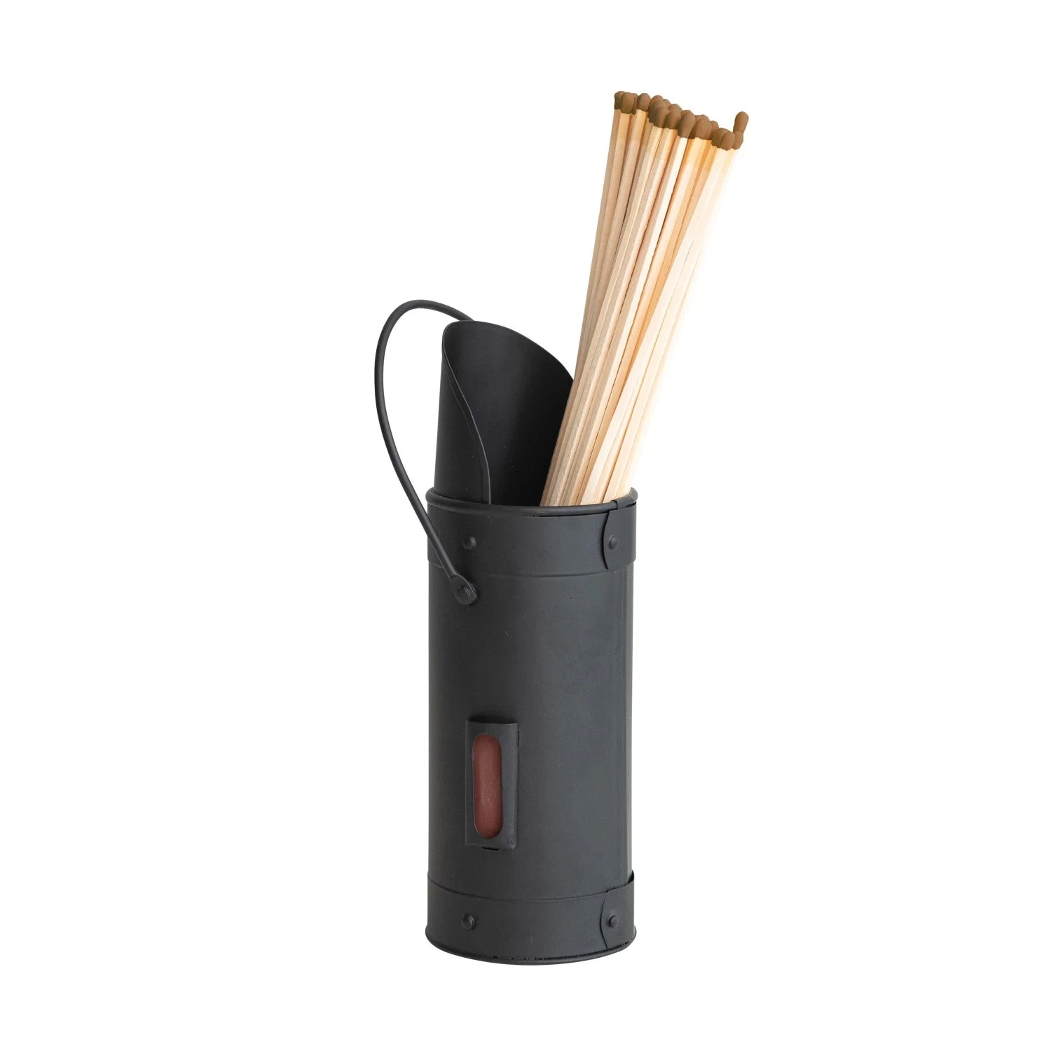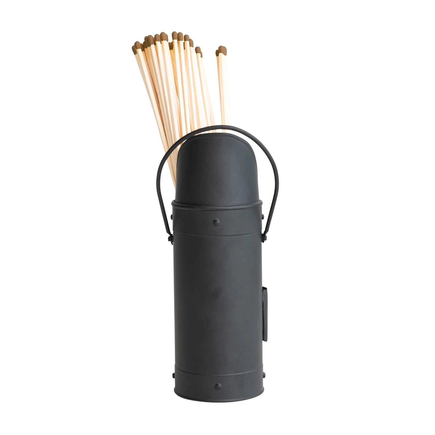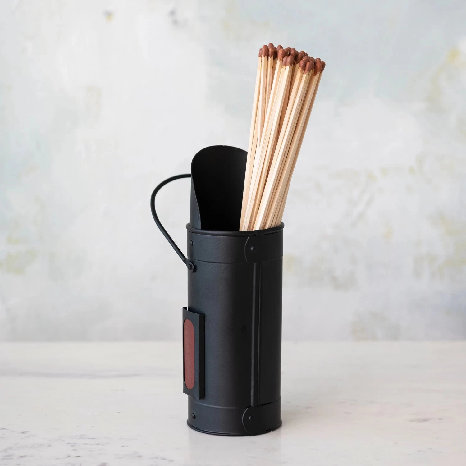 Illuminate your space with our exquisite Matchsticks in Holder. This 3″ round holder is made of metal and comes with a convenient handle, striker pad, and 60 safety matches. The black finish adds a touch of sophistication to any decor. Perfect for lighting candles or starting a cozy fire.