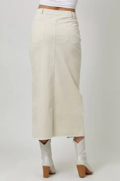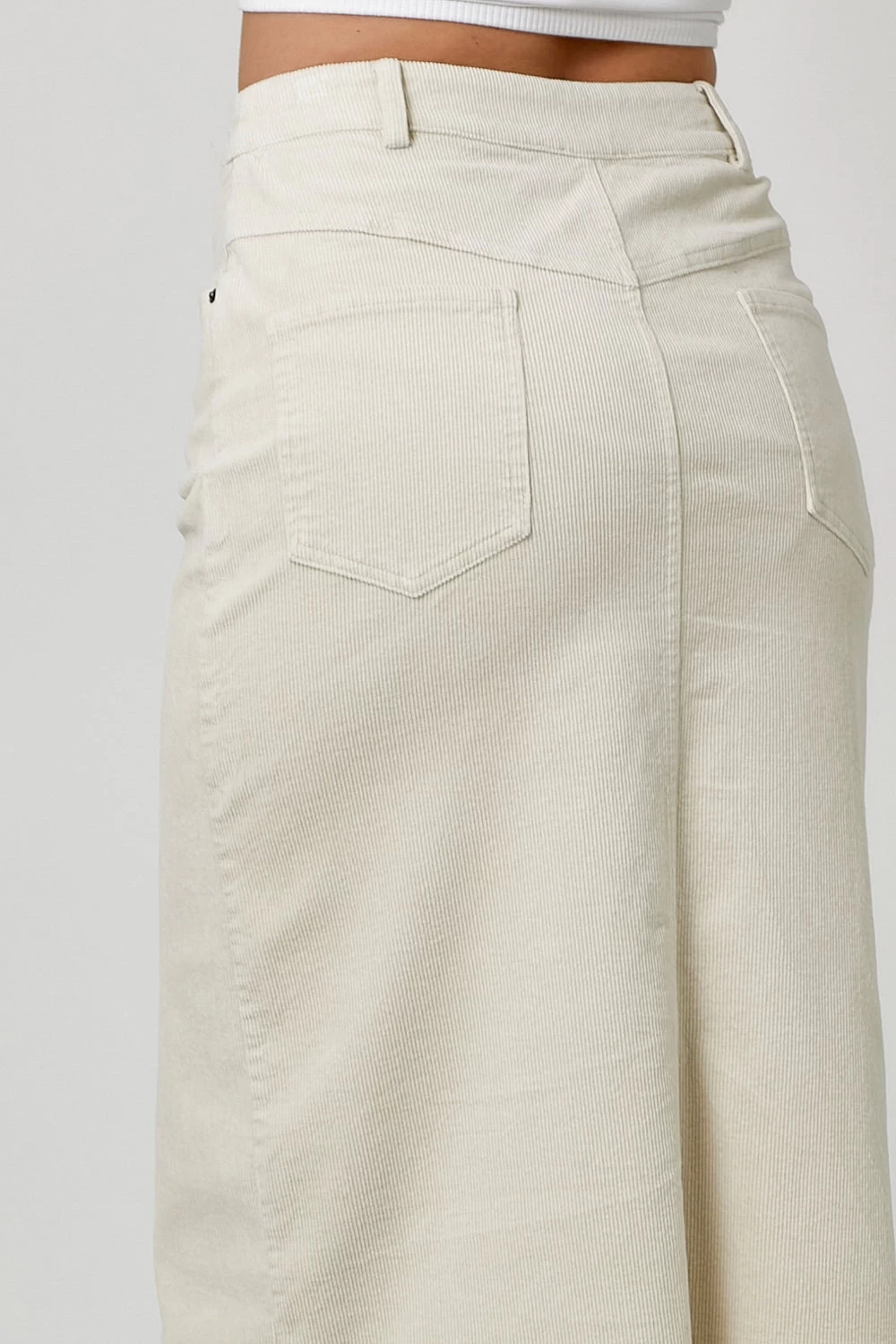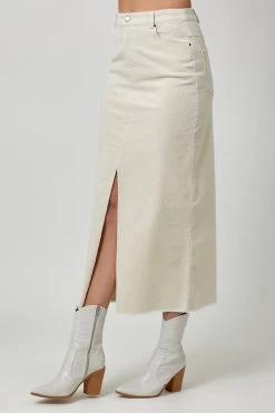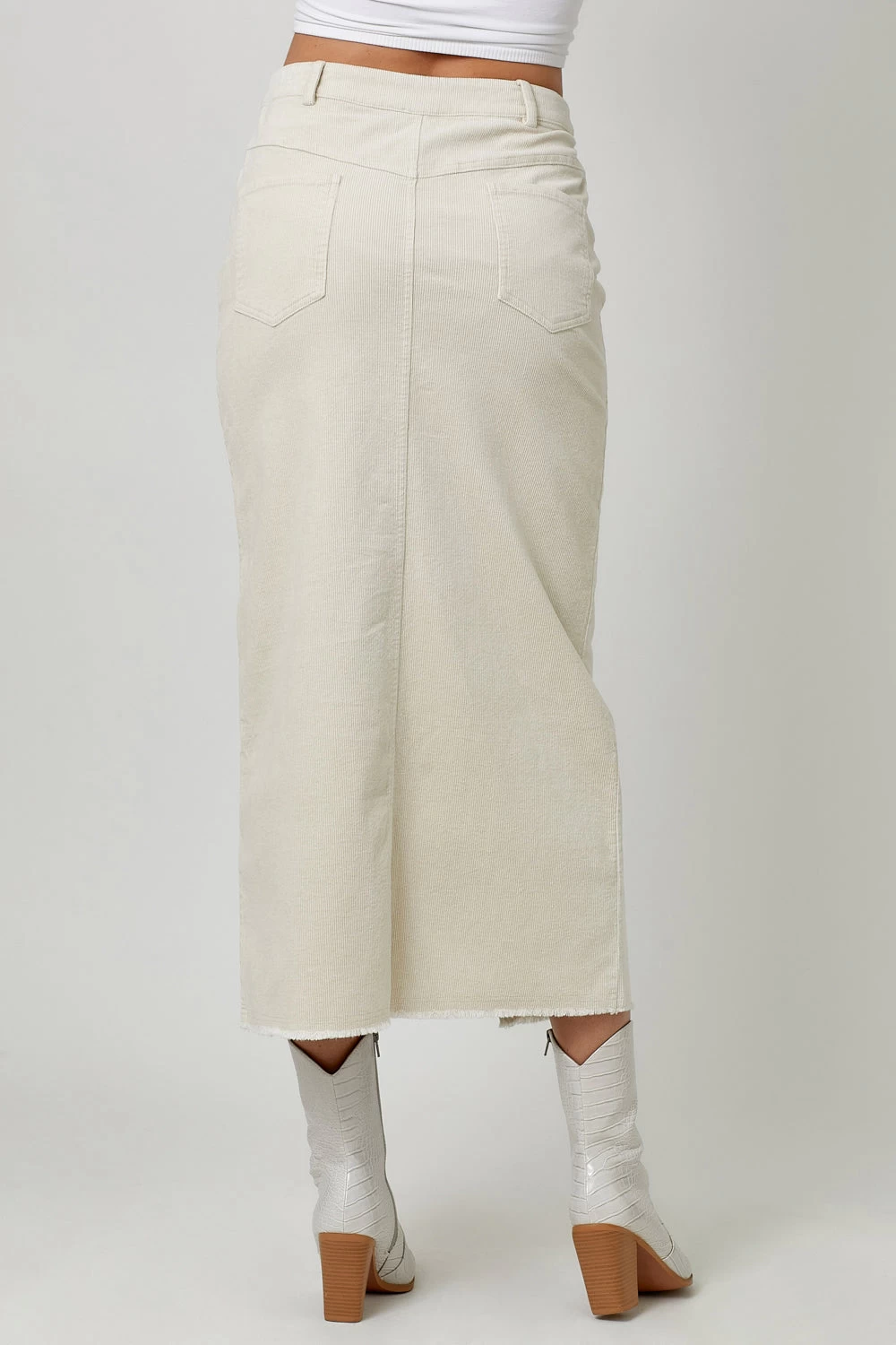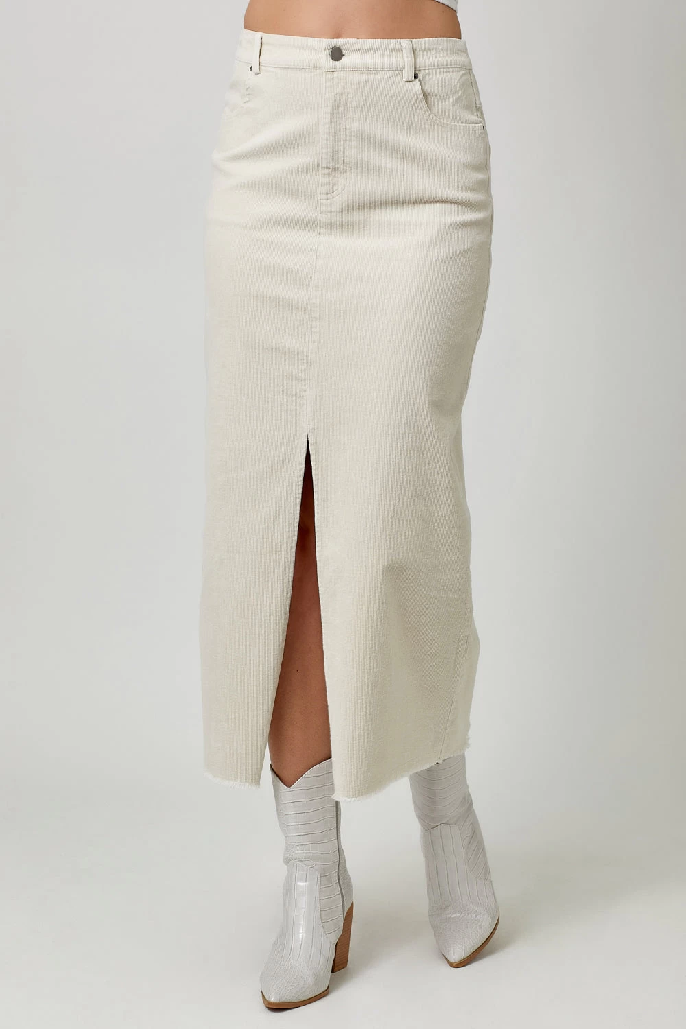 Indulge in the sophisticated elegance of the Melanie Corduroy Skirt. Crafted from washed corduroy in vintage white, this skirt boasts a front slit for added allure. Perfect for elevating any outfit with its luxurious texture and timeless style.