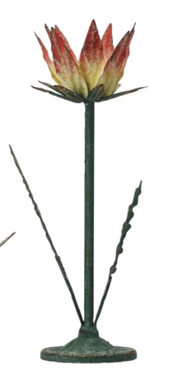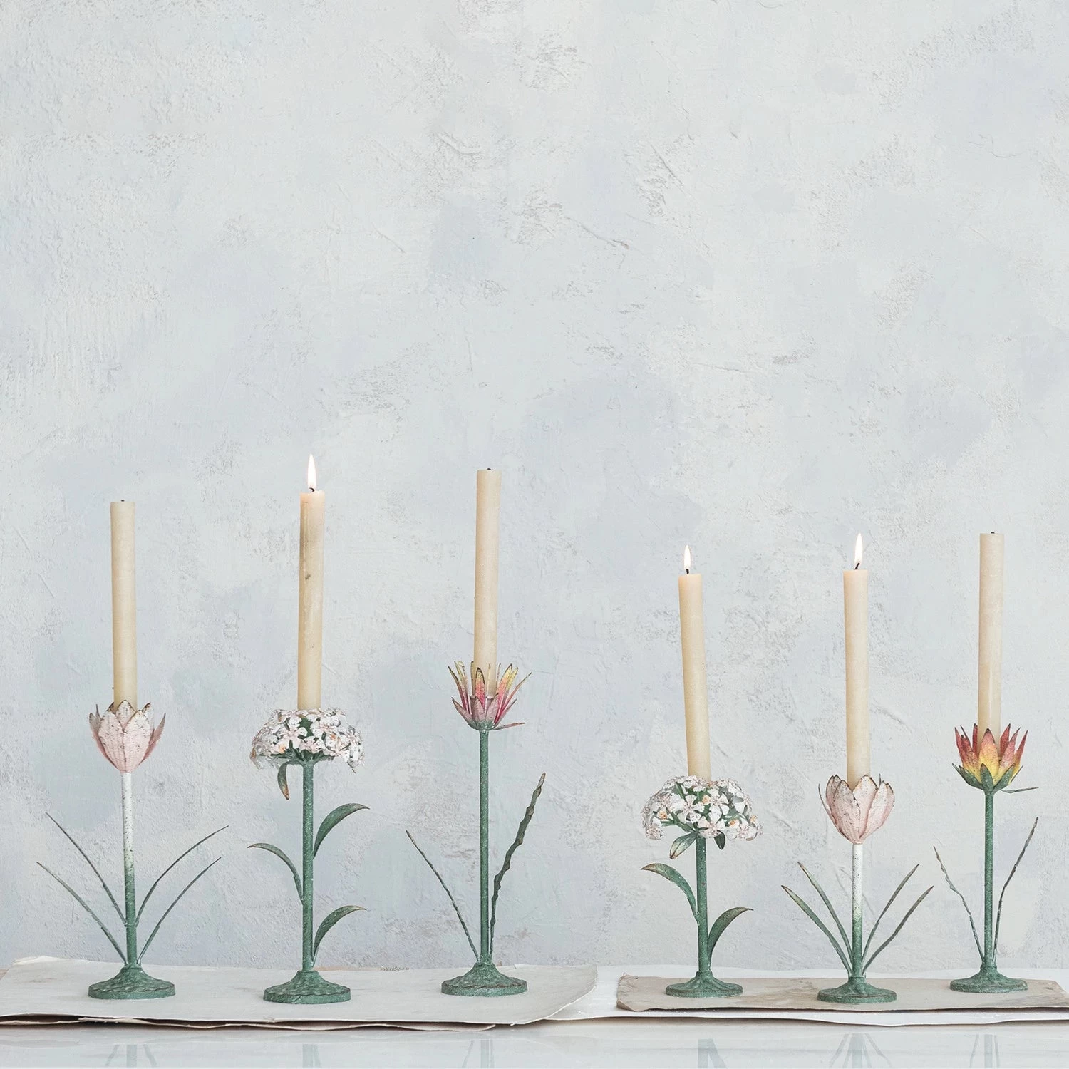 Elevate your home decor with our Metal Flower Taper Holder. Standing at heights of 9-10.75 inches, this vintage-inspired piece boasts a charming painted and distressed finish in 3 stunning styles. Effortlessly add a touch of class and elegance to any room with this multi-colored holder.