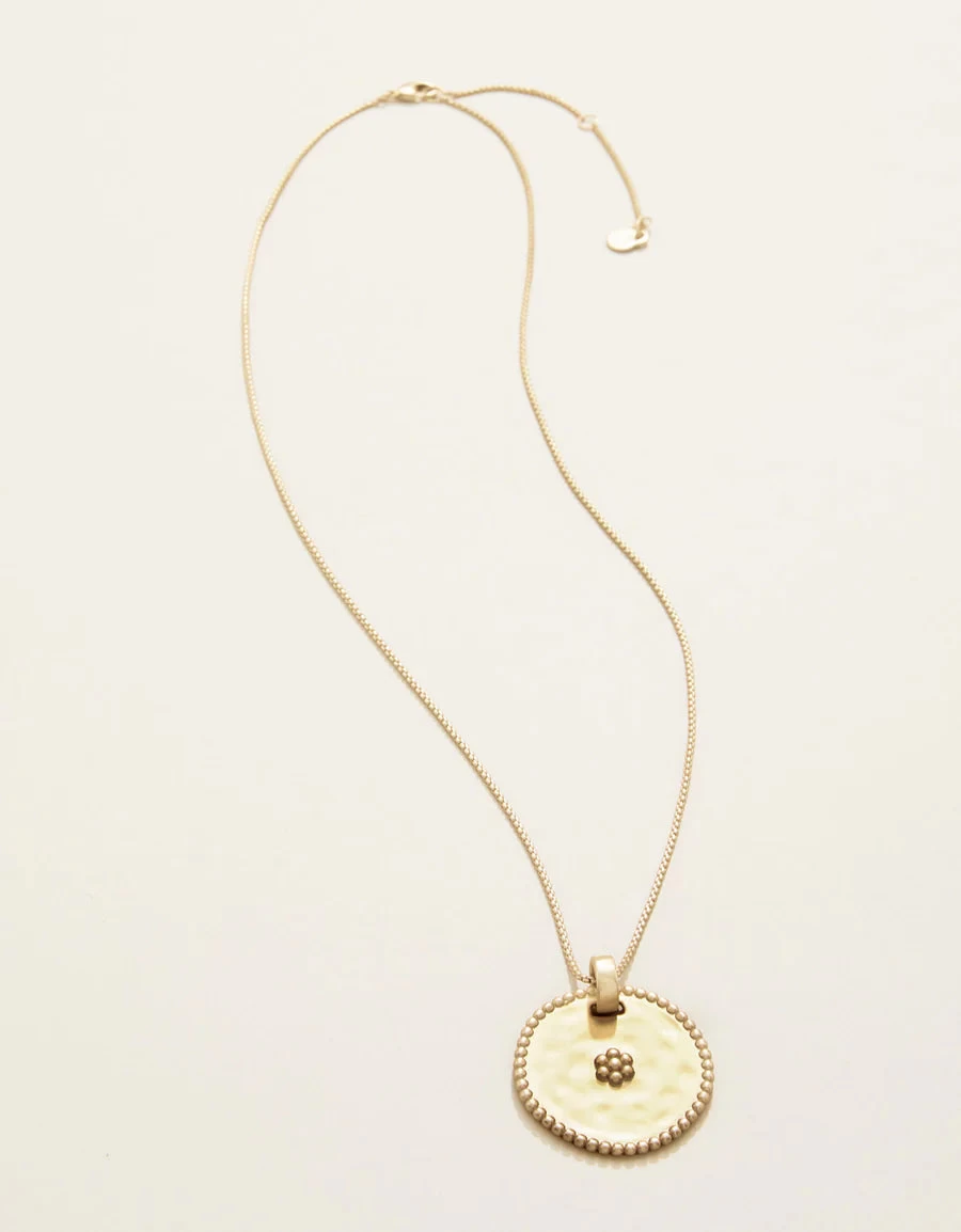 Complete your look with the Milly Coin Necklace. This vintage-inspired pendant boasts a delicate golden flower on a textured 18kt matte gold plated coin, accented by a beaded edge. Timelessly elegant, it’s perfect for layering with your favorite pieces.