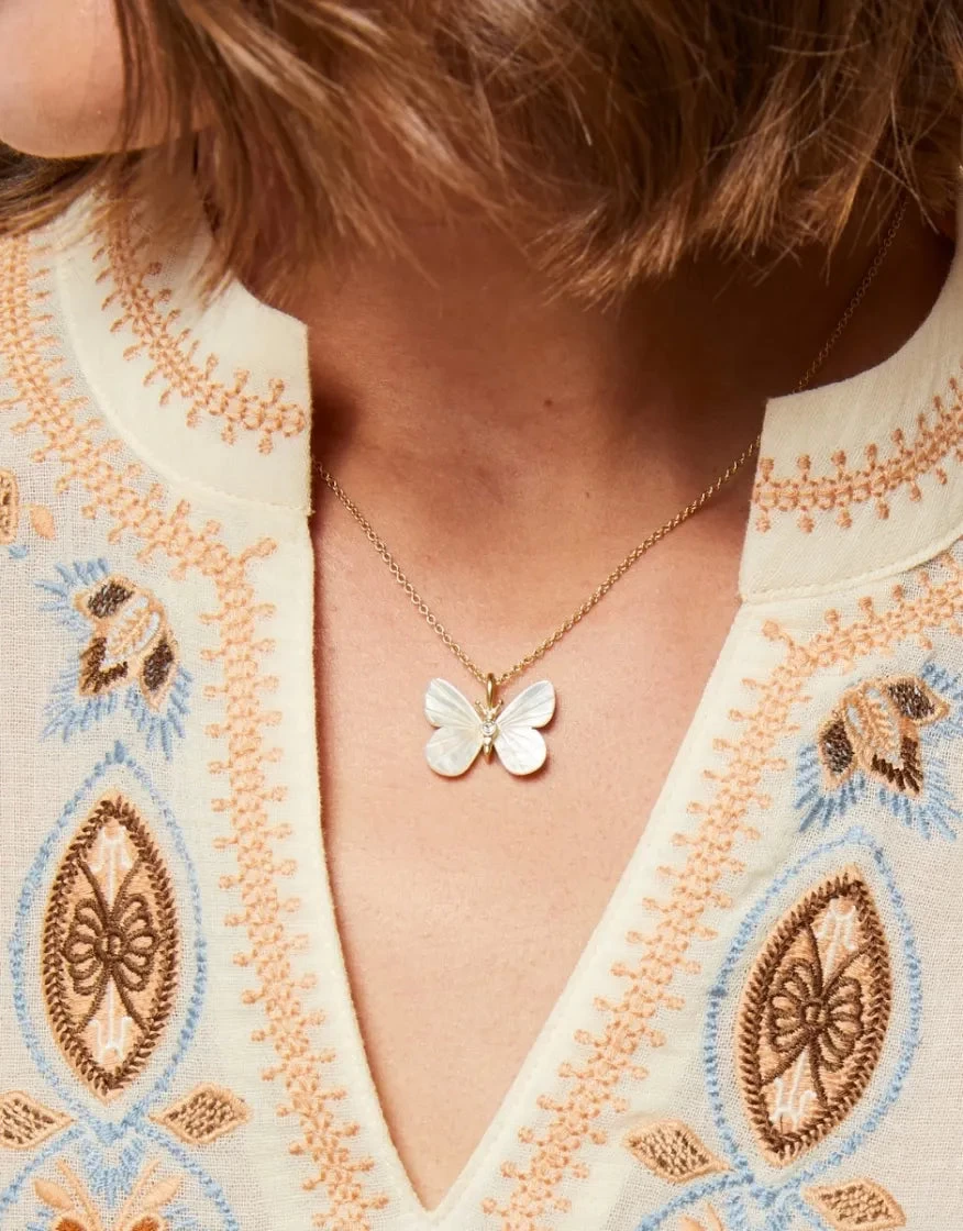 Indulge in new beginnings with this exquisite Monarch Carved Necklace. Made with 18k gold plating and Mother-of-Pearl wings, this butterfly pendant symbolizes the beauty of transformation. Flutter into a new chapter with grace and elegance.