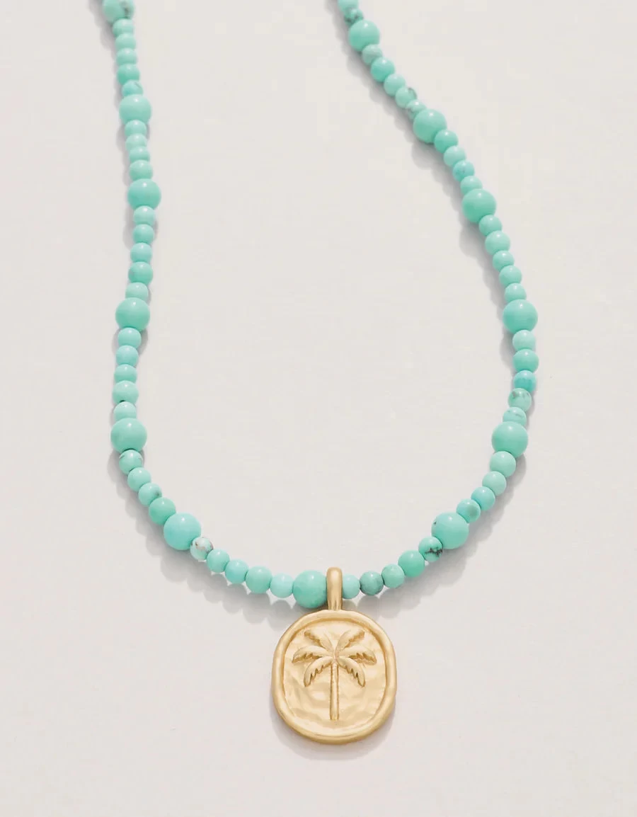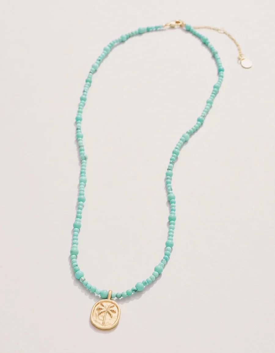 Embrace the tranquil allure of the sea with our Palm Tree Harmony Necklace. Crafted with an 18kt matte gold plated palm tree charm, this necklace is adorned with delicate turquoise beads. Let the soothing waves of the ocean guide you while wearing this elegant and exclusive piece.