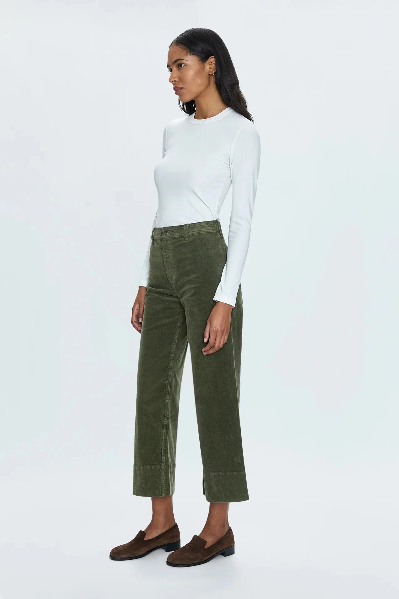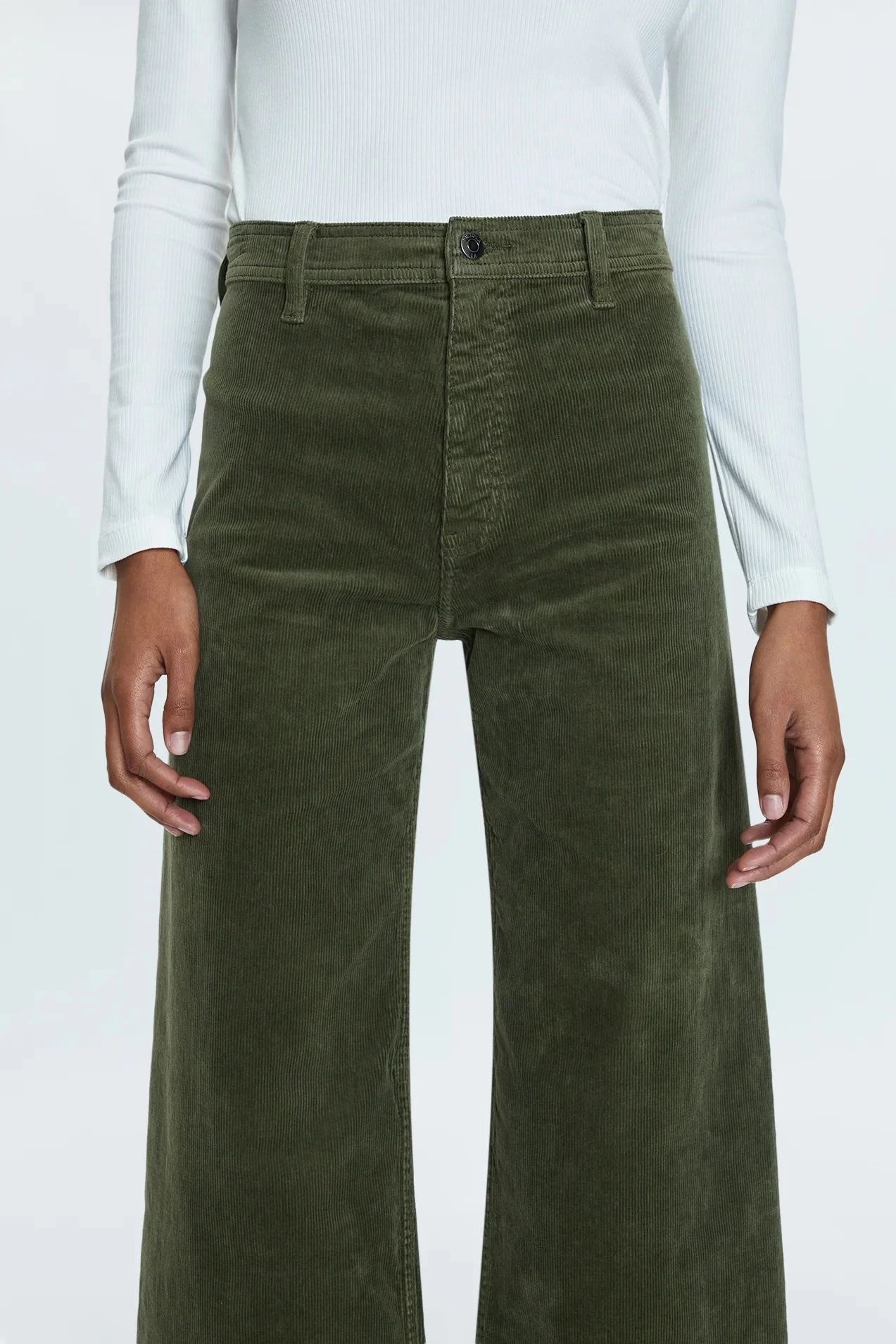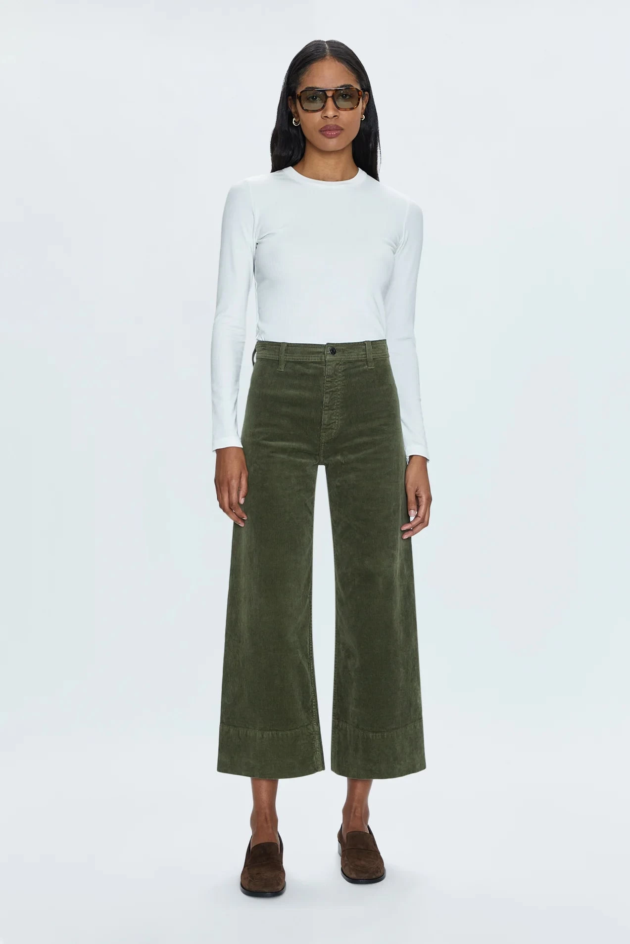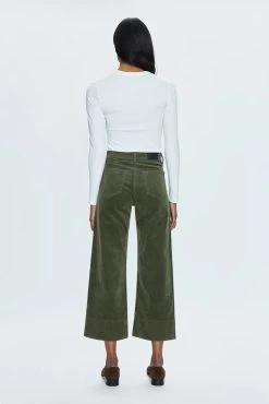 Indulge in luxury and sophistication with our Penny Crop High Rise Wide Leg in Martini. The high rise waist and cropped, ankle length hemline elongate the silhouette while the soft textured corduroy and comfort stretch denim provide ultimate comfort. The warm olive green color with a subtle sheen adds a touch of elegance.