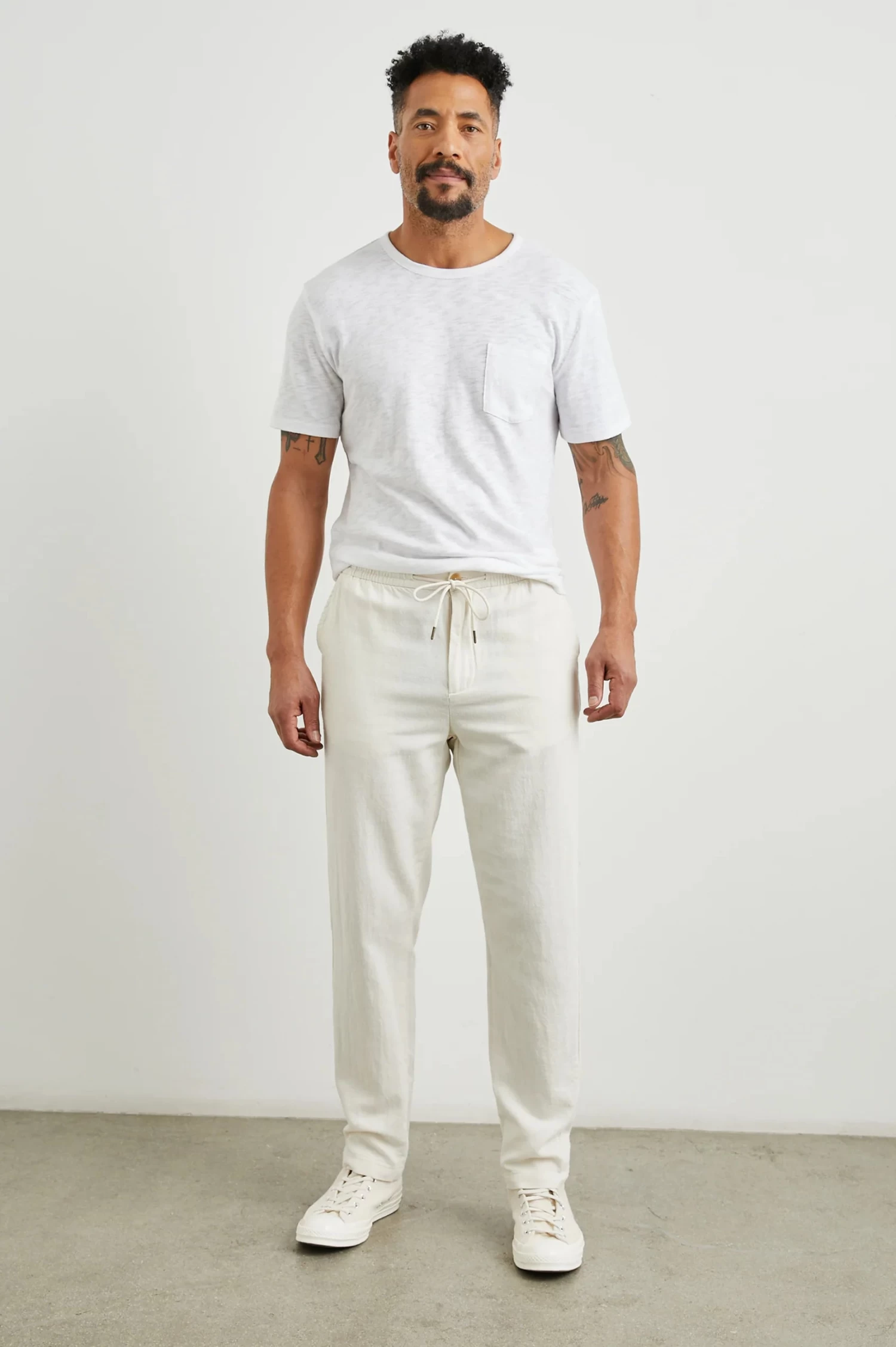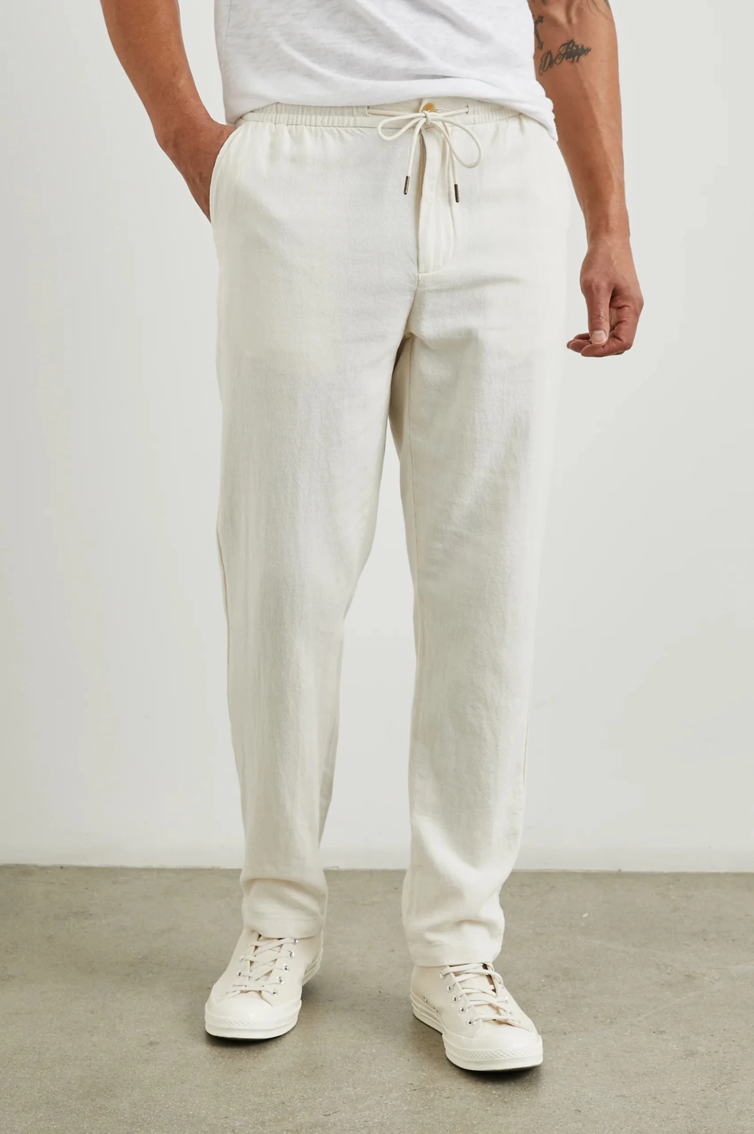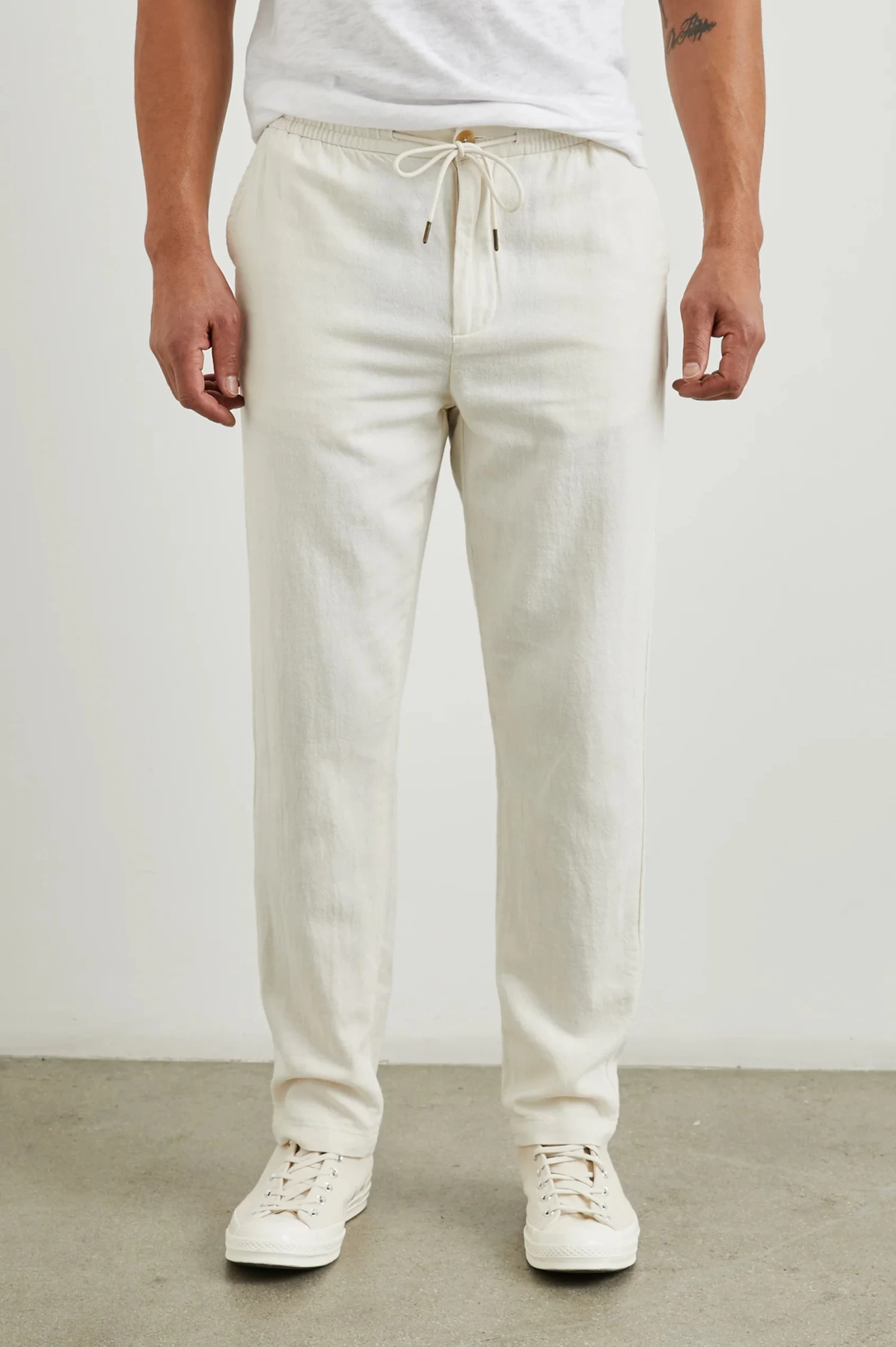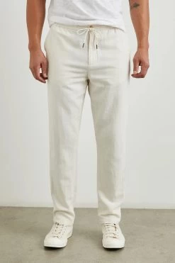 The Callum Pant in Ecru by Rails redefines casual sophistication, transforming the classic lounge pant into the ultimate pair of elevated, comfortable slacks. Expertly crafted from a breathable cotton-linen twill, these pants offer a lightweight feel perfect for warm-weather wear. Designed with a slightly tapered, straight-leg fit, the Callum combines ease and polish with an elastic waistband and adjustable drawstring for a customizable fit. Whether dressed up or down, this versatile essential delivers effortless style and all-day comfort—ideal for the modern man seeking refined, everyday wear.