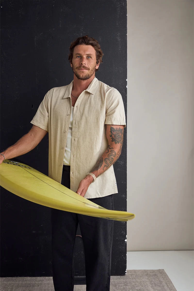 Effortlessly versatile, the Classic Linen Short Sleeve Shirt in Sand by Rhythm is a timeless men’s linen shirt crafted from a breathable linen-cotton blend for all-season comfort. With a relaxed fit, straight hem, and soft-touch feel, this short sleeve summary-up shirt is perfect for layering or wearing on its own. Whether styled open or closed, it’s a go-to essential for laid-back days and modern wardrobes alike.