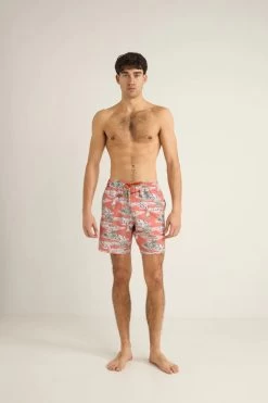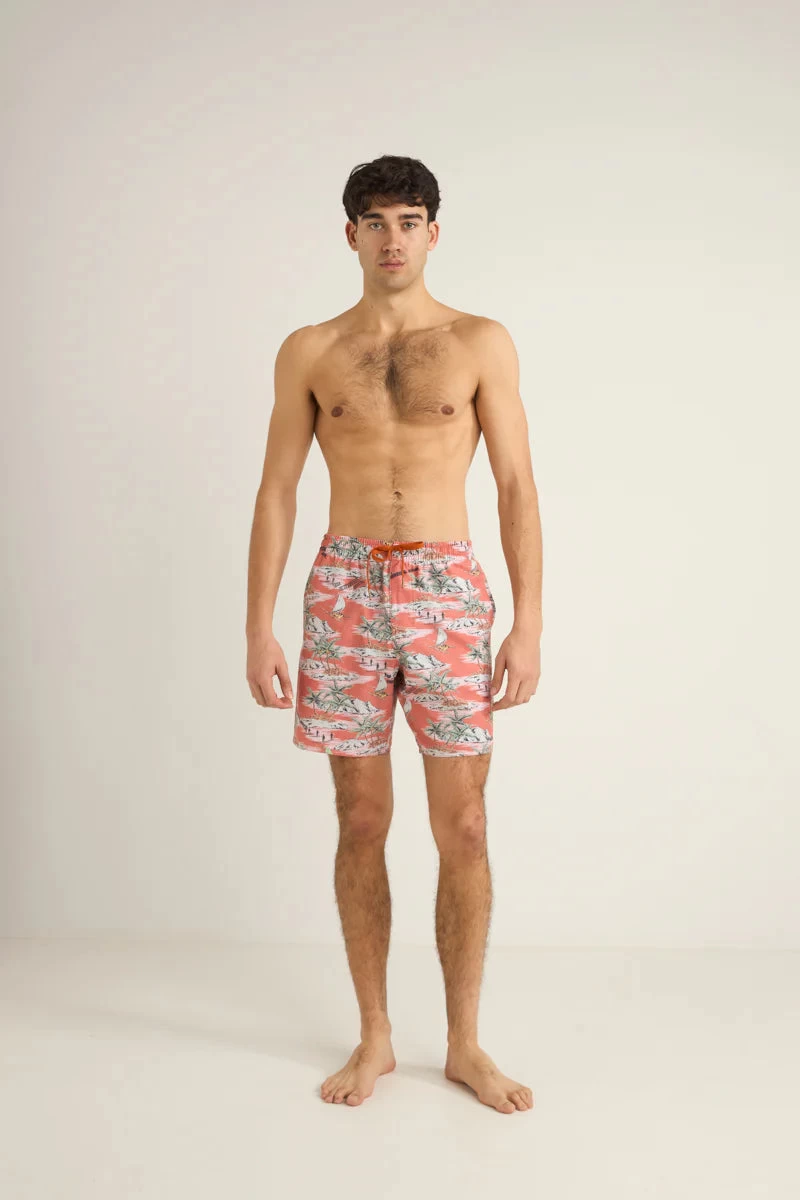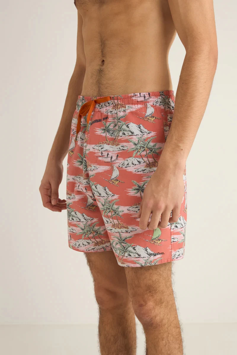 Escape to paradise in the Tropical Beach Short in Dawn by Rhythm—a versatile men’s boardshort designed for sun, surf, and exploration. Made from a soft, durable blend of recycled polyester, cotton, and spandex, these 17-inch outseam beach shorts feature a custom tropical print, elastic waistband, and a comfortable, vintage hand feel. Perfect for coastal adventures or laid-back days, they deliver style and function in every wave.