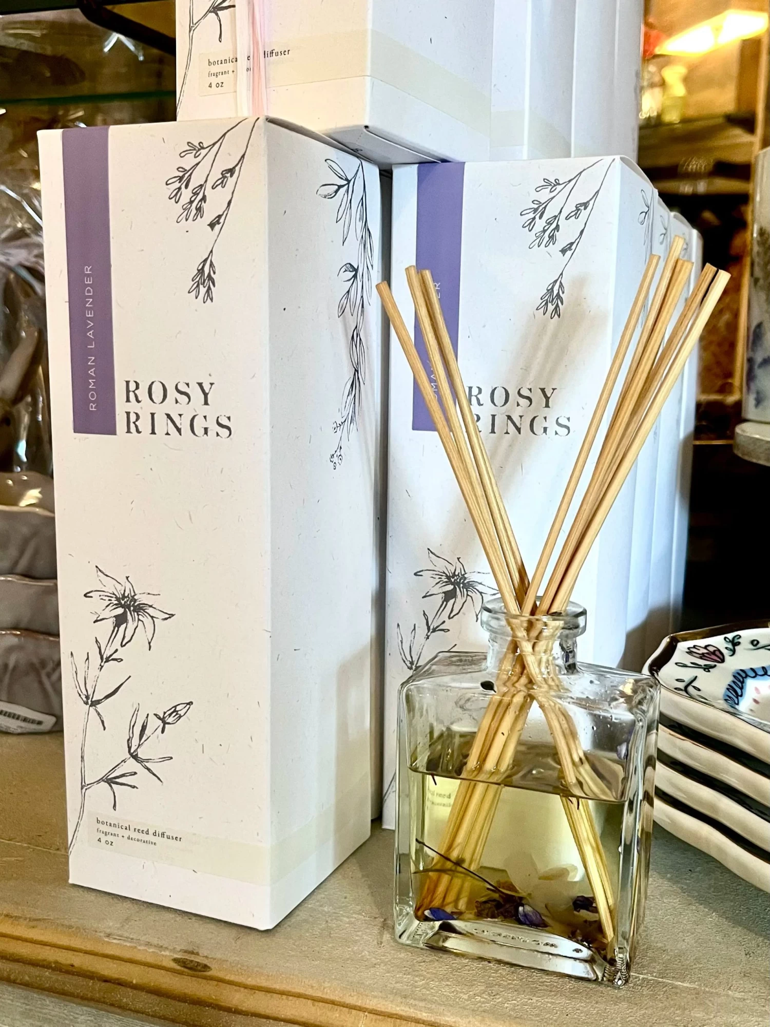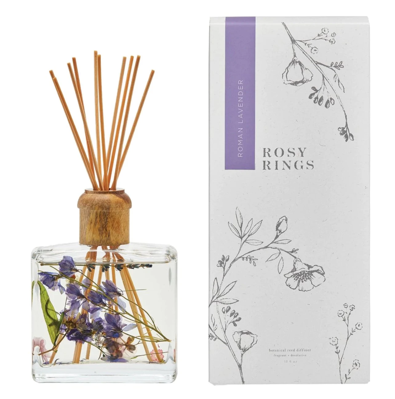Filled with real fruit and spices, the Rosy Rings Roman Lavender Reed diffuser blends lavender, rosemary, sage, basil and olive leaf. Wild iris and coastal cypress softly chime in as the reeds diffuse the botanicals throughout the room. Gorgeous packaging is the perfect complement to dramatic glass bottles filled with real spices, fruit and botanicals. Every object you see inside is painstakingly placed there by hand. Concentrated and highly effective, our diffusers do not contain alcohol.