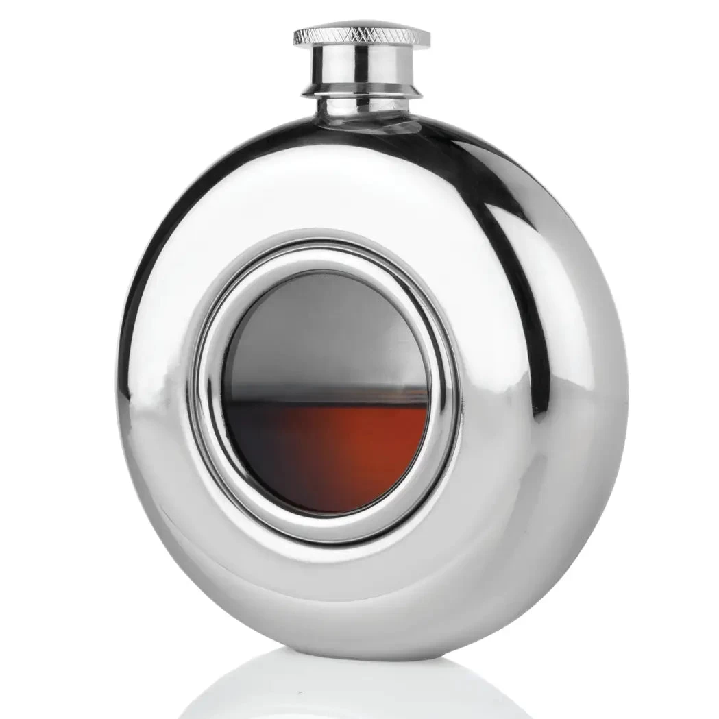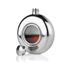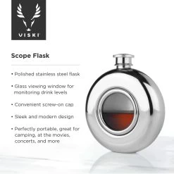 Elevate your drinking experience with our premium Scope Flask. Crafted from stainless steel, this five-ounce flask features a unique glass porthole window that allows you to keep an eye on your liquor level. Never get caught off guard again – refill in style with our sophisticated flask.