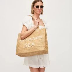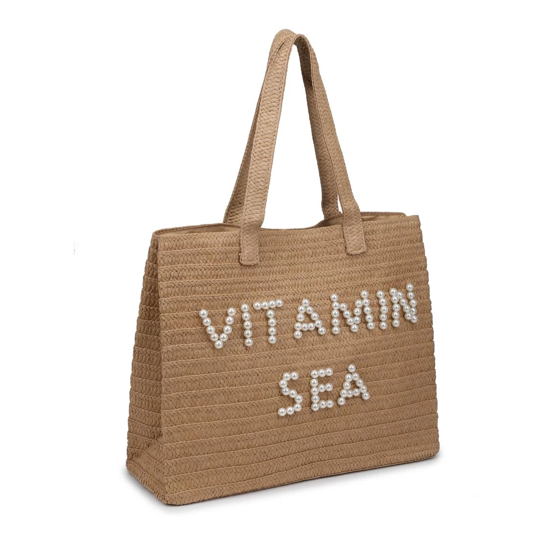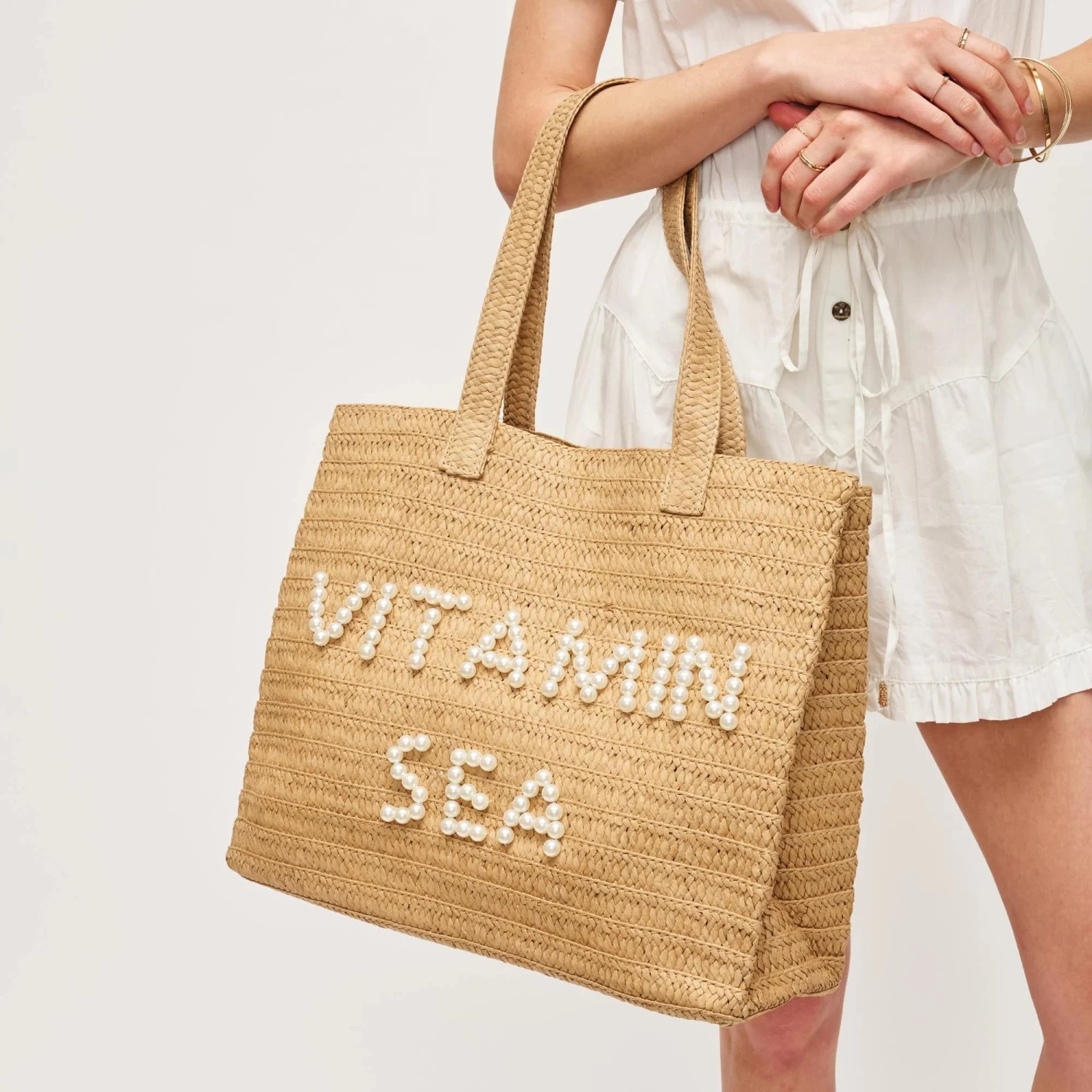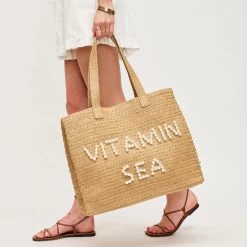 Channel your inner beach goddess with the Seaton – Pearls Vitamin Sea straw tote. The natural woven design is effortlessly chic, while the woven slogan text adds playful personality. Gold hardware adds polish, and the magnetic snap closure keeps everything secure. Inside, a zip pocket and two slip pockets keep your essentials organized. Spacious enough for beach essentials or everyday errands, this tote is your new warm weather staple.