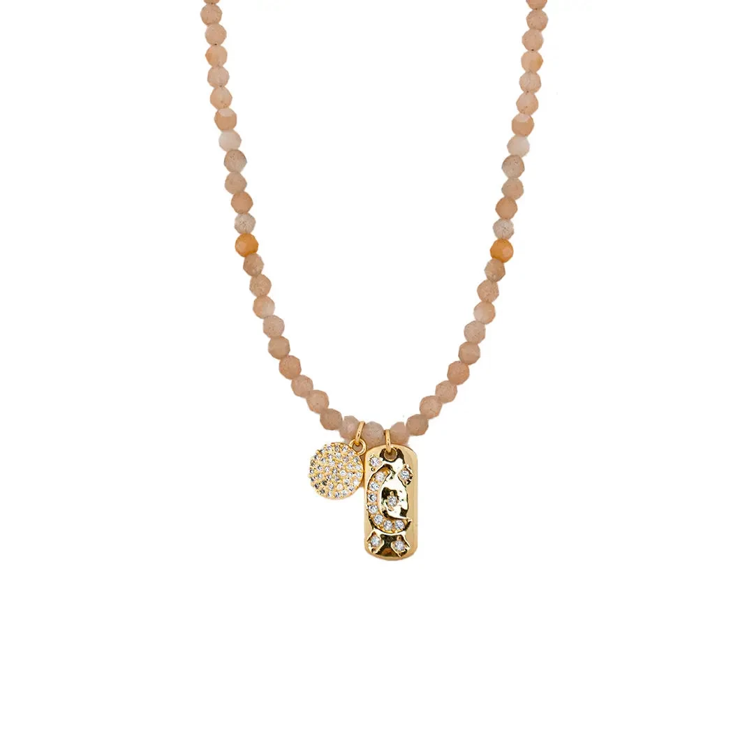 Elevate your ensemble with our glistening Semiprecious Stone Necklace in Orange Jade. The gold plated 15″ chain showcases a mesmerizing labradorite stone, adorned with charms for an elegant touch. With a 3″ extension, this necklace offers effortless versatility and sophisticated style.
