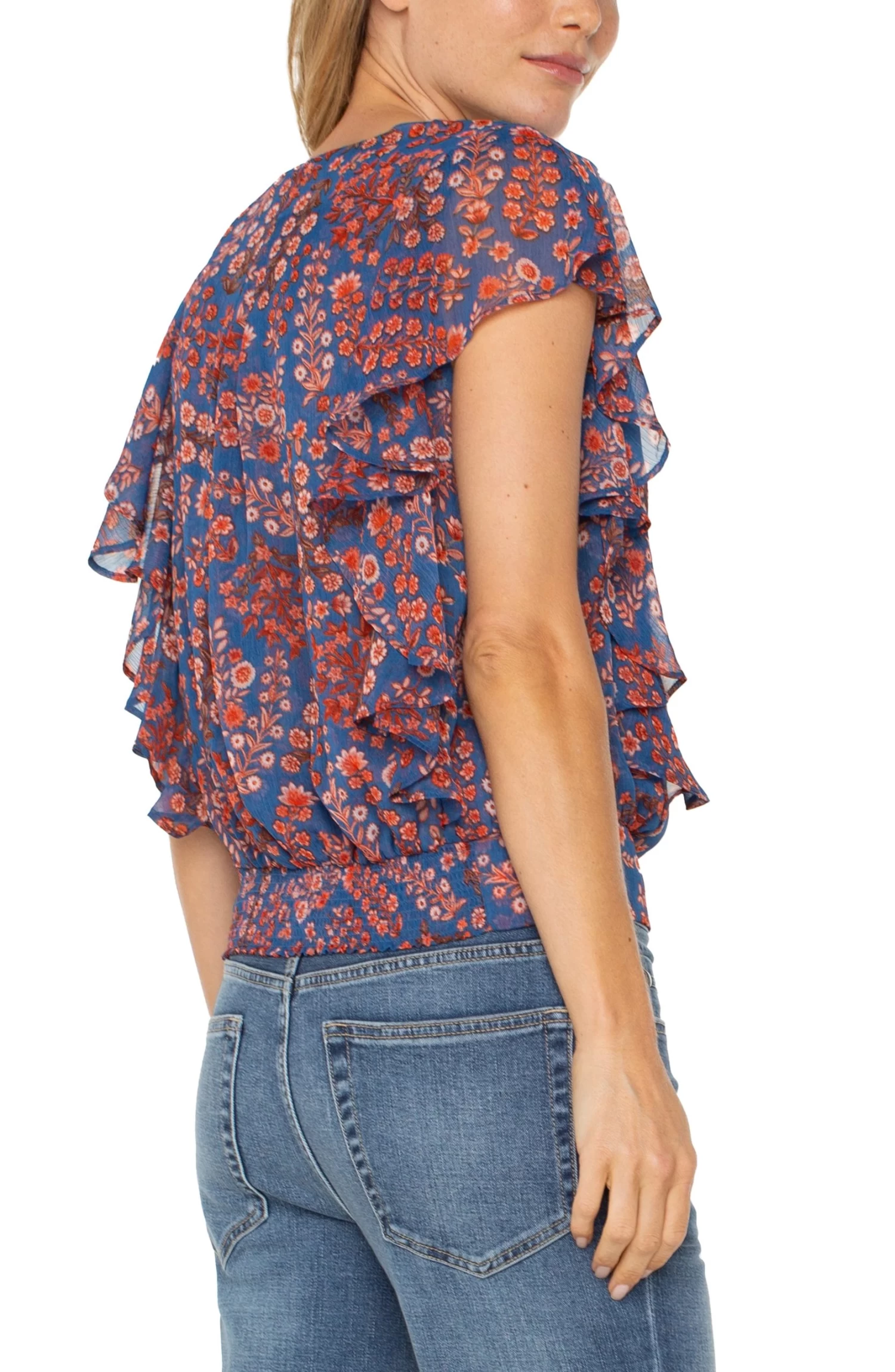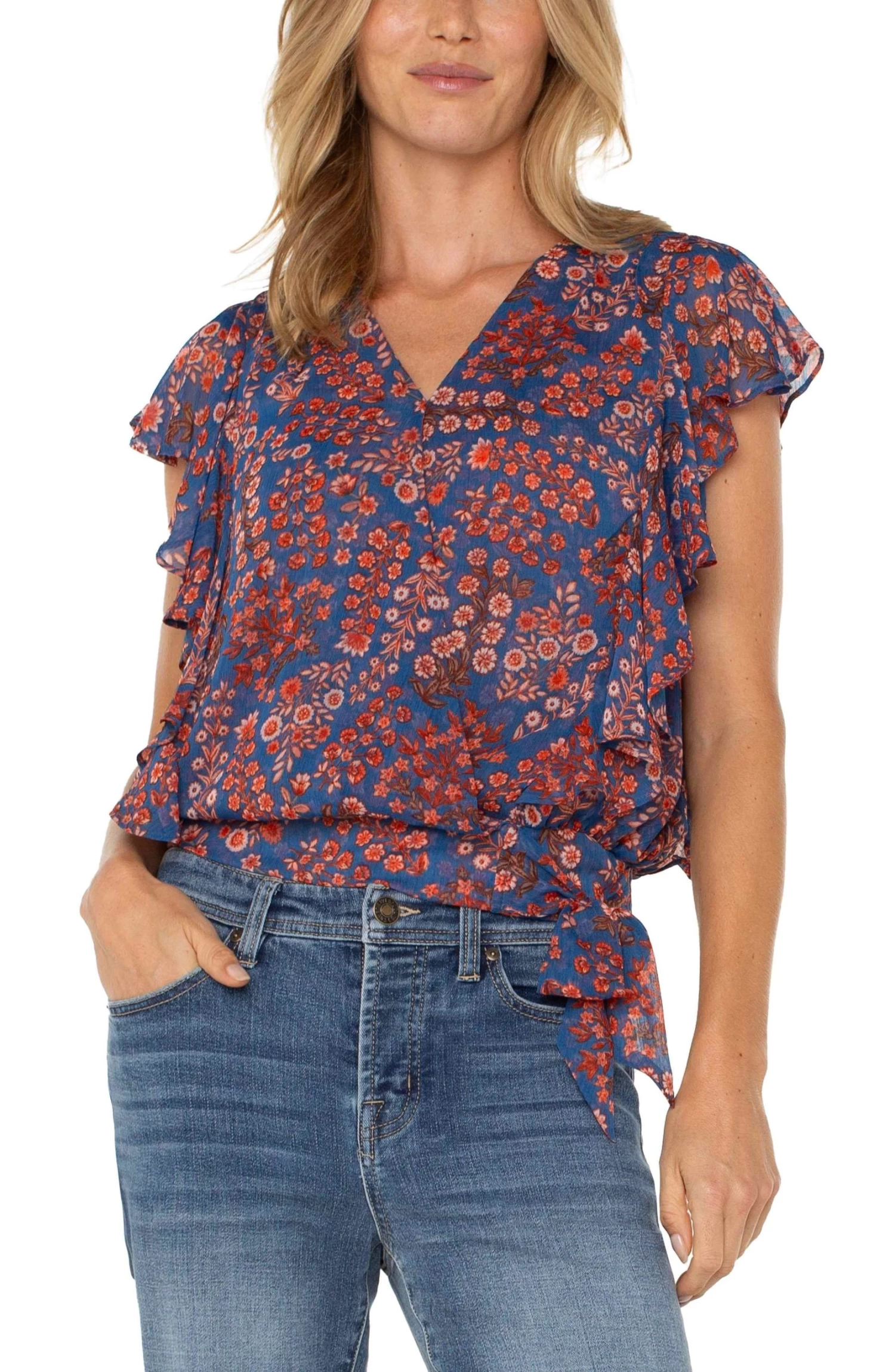 Transform your wardrobe with our Short Ruffle Sleeve Draped Blouse. This Liverpool Exclusive floral printed top boasts a flattering draped front and waist tie, along with playful ruffle sleeves. Its versatile design makes it the perfect match for denim, effortlessly elevating any casual or dressy look. In blue and pink floral hues, this blouse is a stunning addition to your collection.