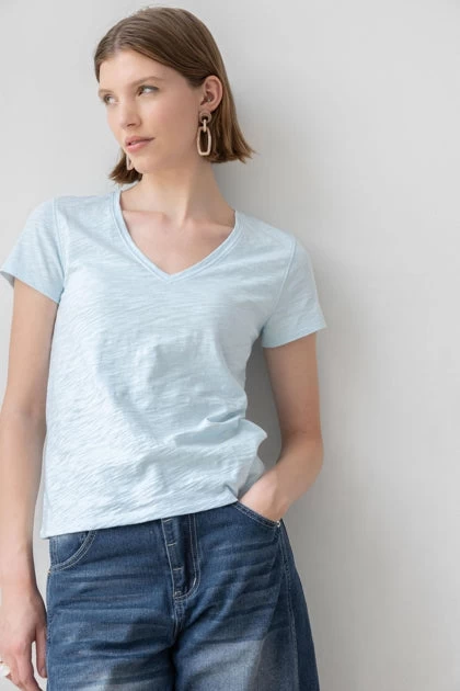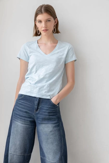 Elevate your wardrobe with our best-selling Short Sleeve Back Seam V-Neck In Spa. Crafted from luxurious mid-weight cotton slub, this timeless essential features a flattering V-neckline and our signature back seam detail for a touch of sophistication. With just the right amount of coverage, the feminine fit and versatile style make it a must-have.