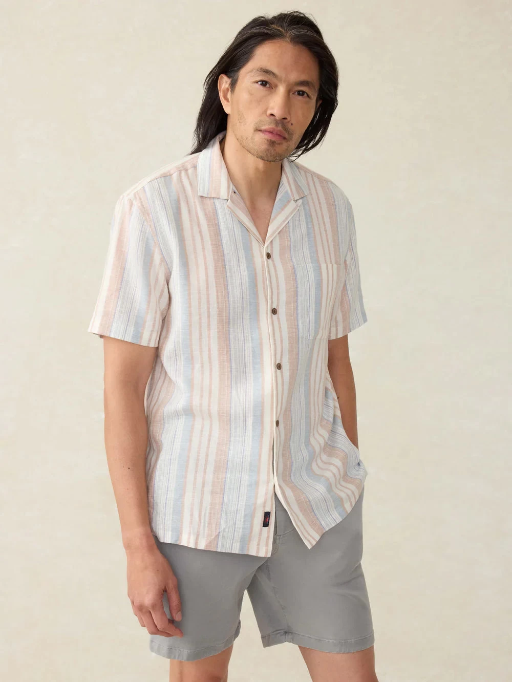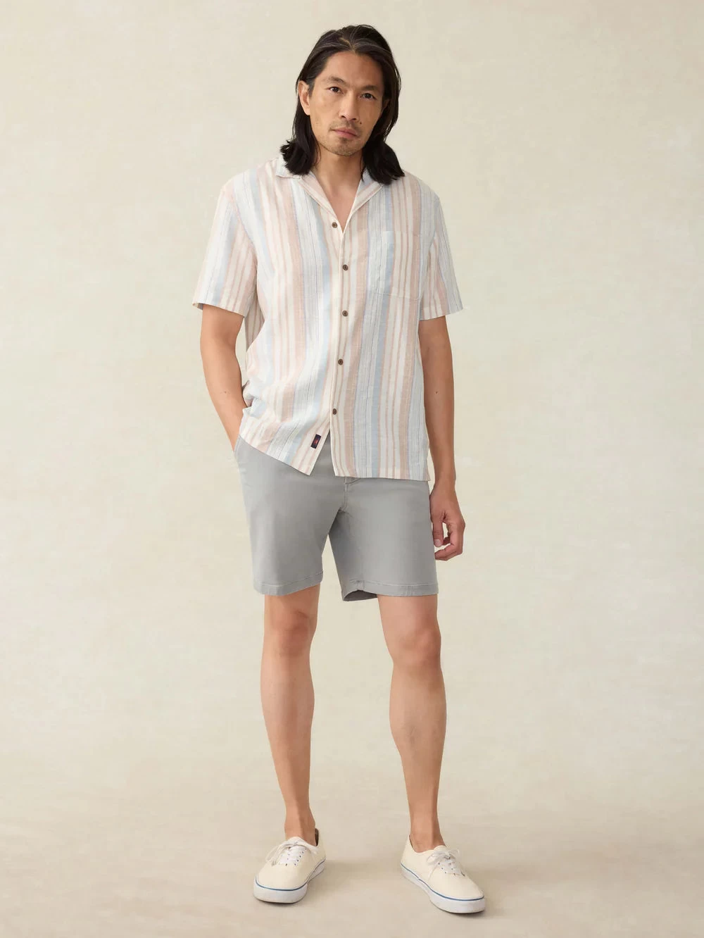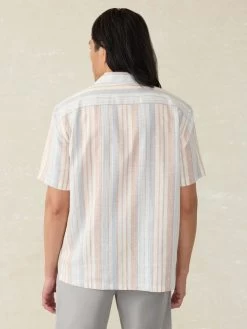 Embrace summer with the Short-Sleeve Breeze Camp Shirt in Golden Beach Stripe by Faherty. This throwback style features a loose fit and a perfectly washed fabric that offers softness and comfort. Made from a cool cotton blend, it’s what summer dreams are made of. Whether you’re heading to the beach or enjoying a fun night out, this shirt has you covered. For the perfect collar, lightly steam and fold it to your desired starting point, as Mike Faherty recommends starting at the first summary for a relaxed look.