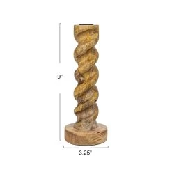 Elevate your home decor with our Small Twisted Taper Holder. Made from intricately hand-carved mango wood, this exquisite piece boasts a natural finish for warmth and rustic charm. Standing at 9 inches tall with a 3.25 inch diameter, it adds an exotic touch to any space. Perfect for both casual and formal occasions, this versatile holder effortlessly adds elegance to any room.