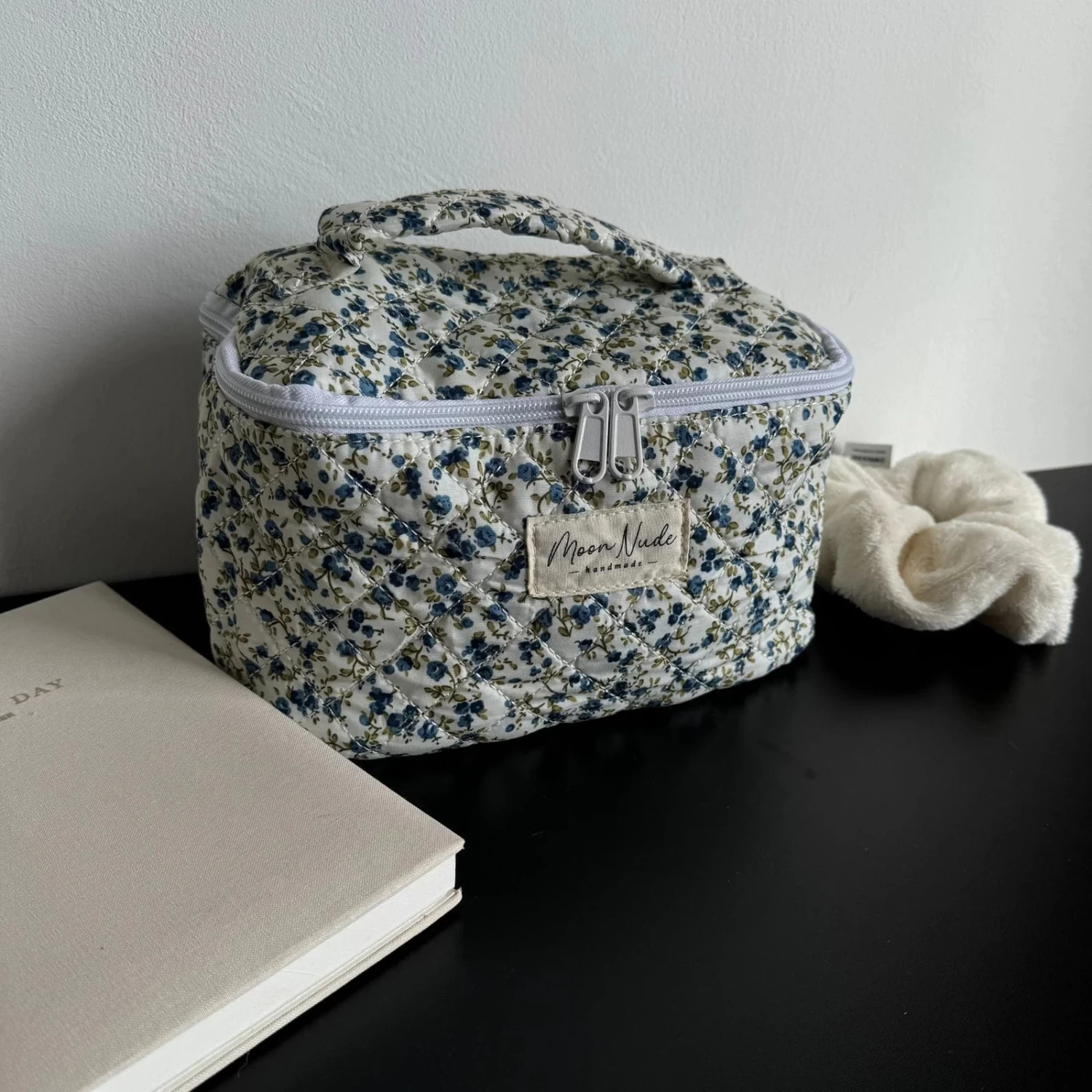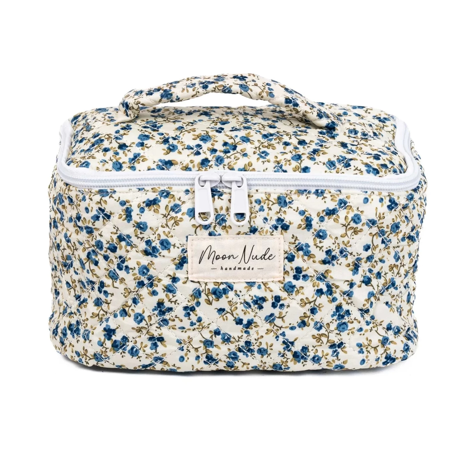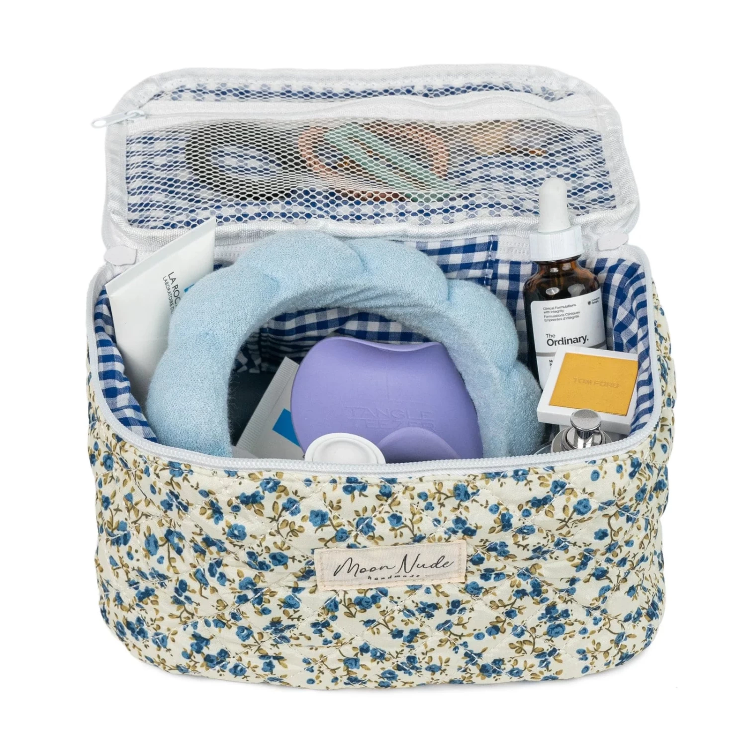 Our Spring Vanity Bag is a functional, medium-size makeup bag designed with both style and practicality in mind. Featuring a convenient handle for easy carrying and a handy compartment for storing smaller items, this bag offers effortless organization. The quilted floral exterior is complemented by a sophisticated blue gingham interior, making it both beautiful and functional. Ideal for organizing your makeup and beauty essentials, or as a travel organizer that fits perfectly inside a suitcase, the Spring Vanity Bag is a must-have for those who appreciate both organization and style.