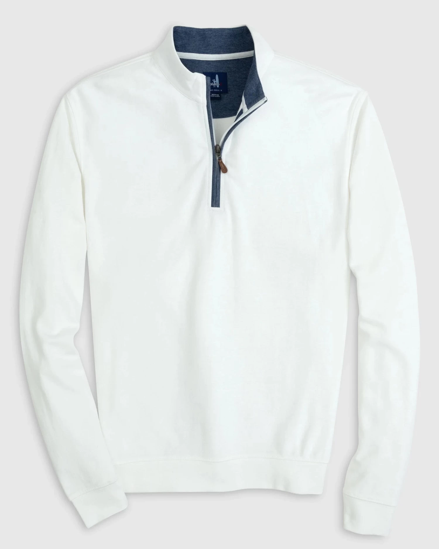 The Sully 1/4 Zip Pullover in White by Johnnie-O is a best-selling men’s quarter-zip layer known for its unbeatable softness and everyday versatility. Made from a premium plaited cotton-blend fabric, this timeless pullover delivers comfort, style, and effortless layering—perfect for the course, office, or weekend wear.