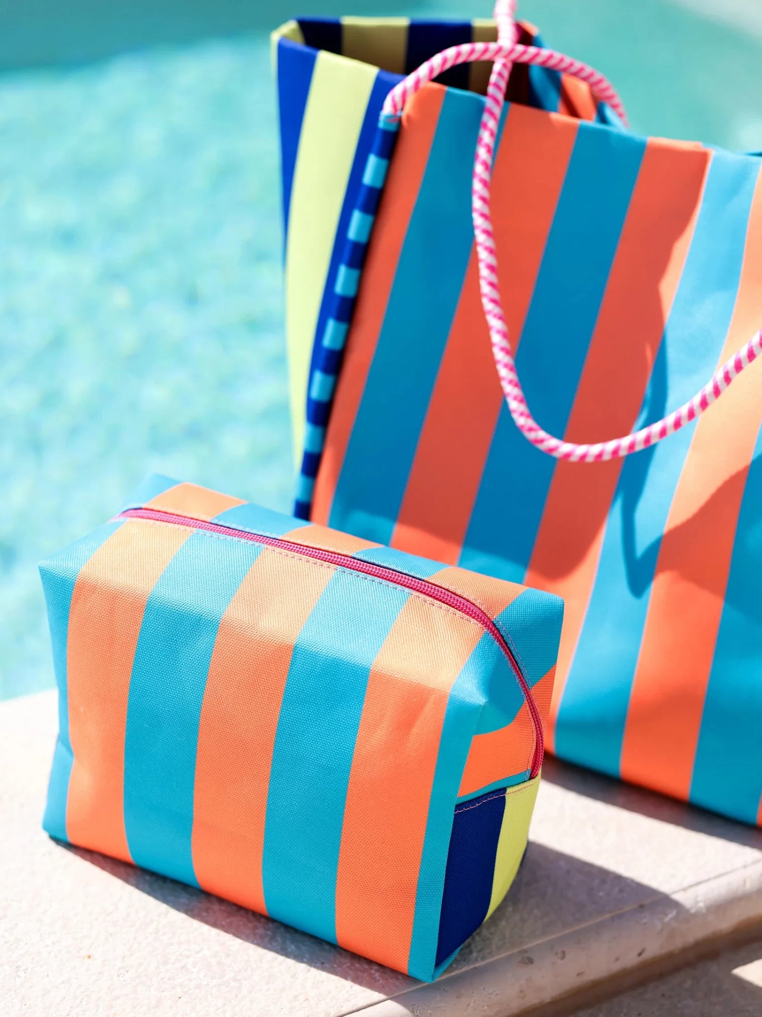 The Taormina Zip Pouch in Blue is a vibrant and stylish accessory perfect for sunny days. Featuring bold stripes in energetic blues and oranges, this boxy pouch is designed to hold all your essentials while keeping you chic. Its structured design, exterior side pockets, and roomy interior make it ideal for beach days, poolside lounging, or quick weekend getaways. Whether you’re stashing sunscreen, snacks, or sunnies, this pouch adds a pop of color to any look. Pair it with the matching Taormina Tote for the ultimate summer ensemble!