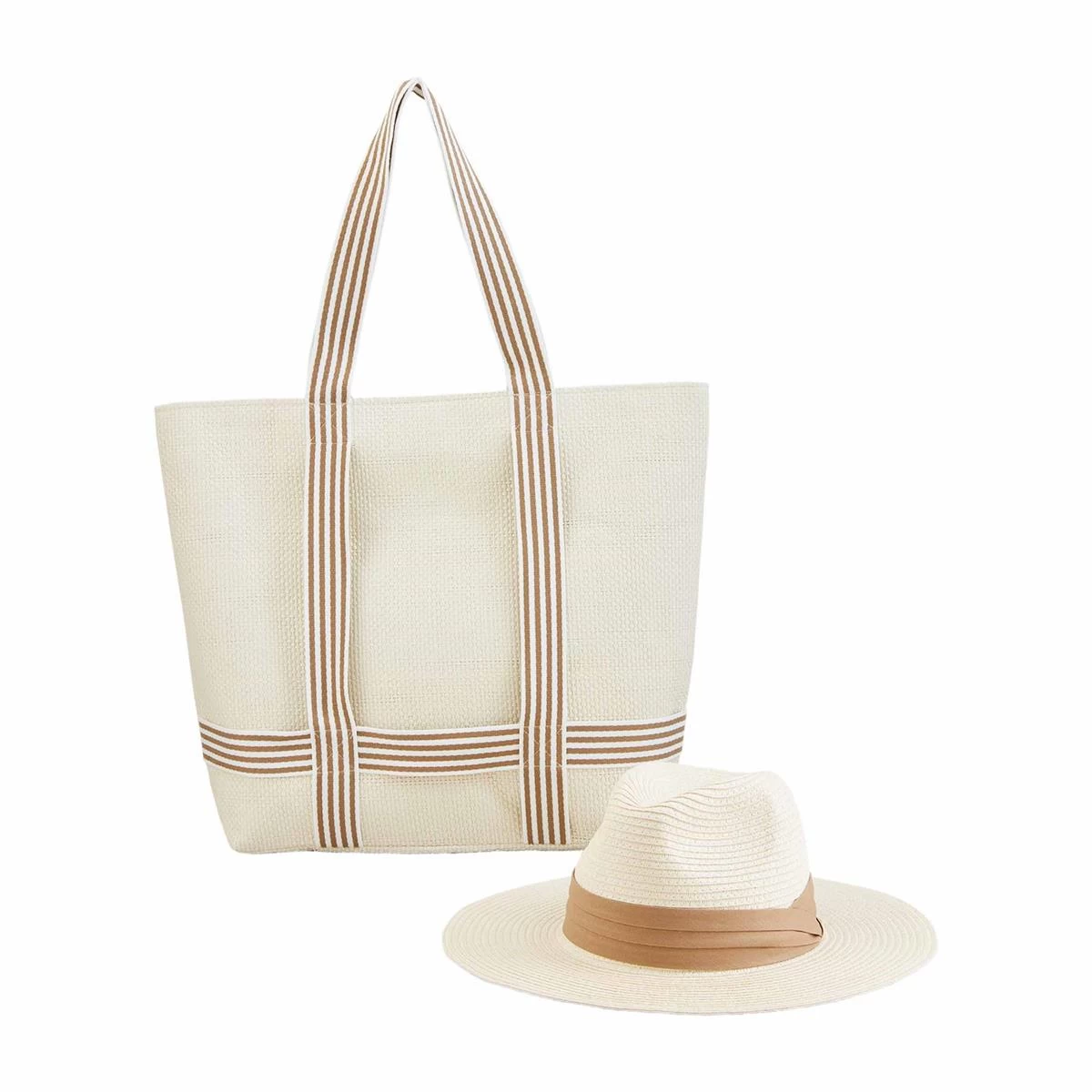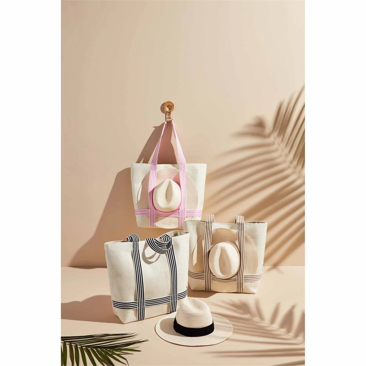 Complete your elegant summer ensemble with our Taupe Hat & Tote Set. Crafted from luxurious lined paper straw, the tote features cotton webbing straps for added comfort and exterior straps to secure the included paper straw hat. Keep cool and stylish with this exclusive 2-piece set.