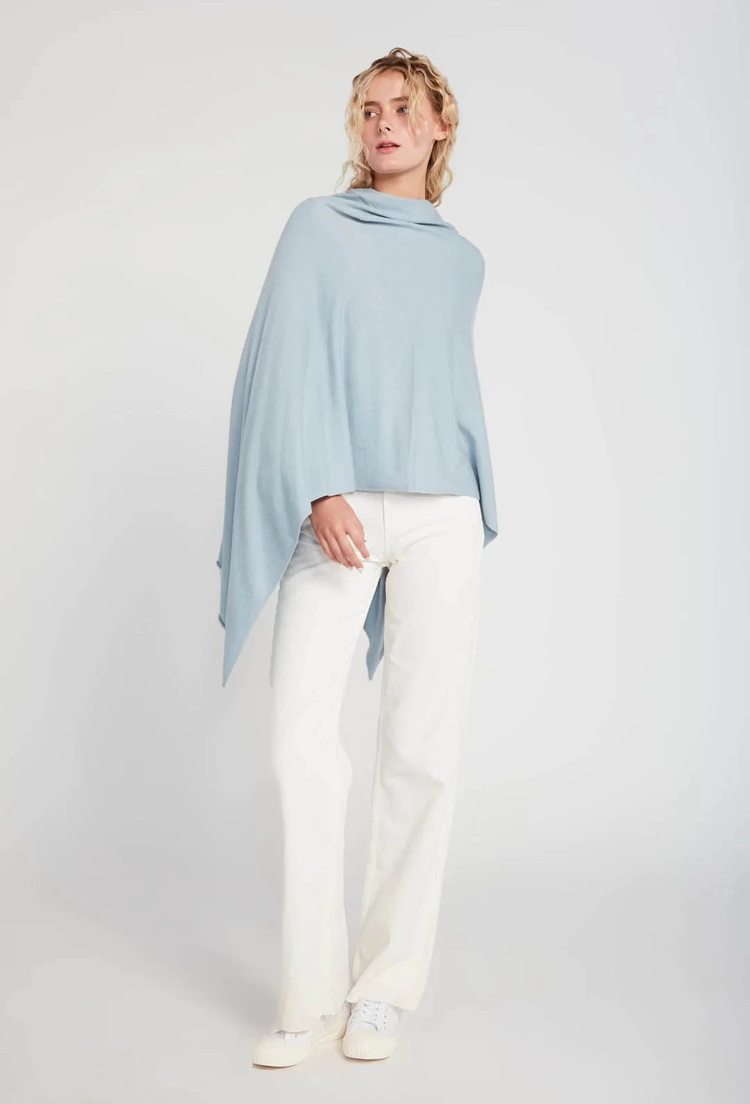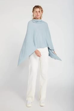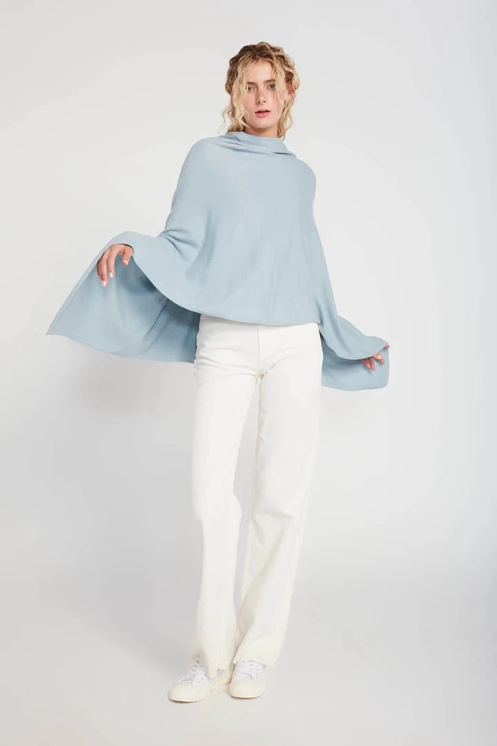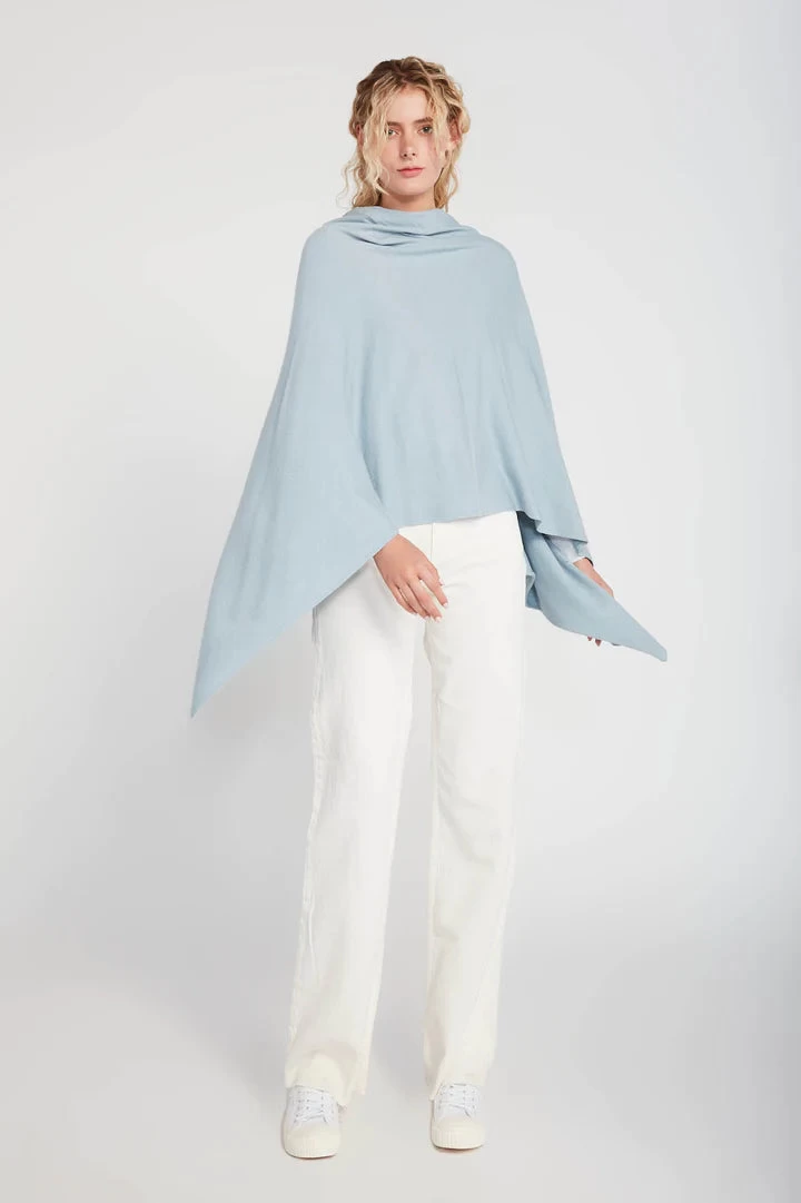 Indulge in luxury with our Terri Triangle Poncho in Light Blue. Versatile and stylish, this chic black poncho is perfect for any occasion – whether it’s running errands or a night out. Its flattering, triangle cut and comfortable fabric make it a must-have in your wardrobe. Pair it with jeans or joggers for a posh look.