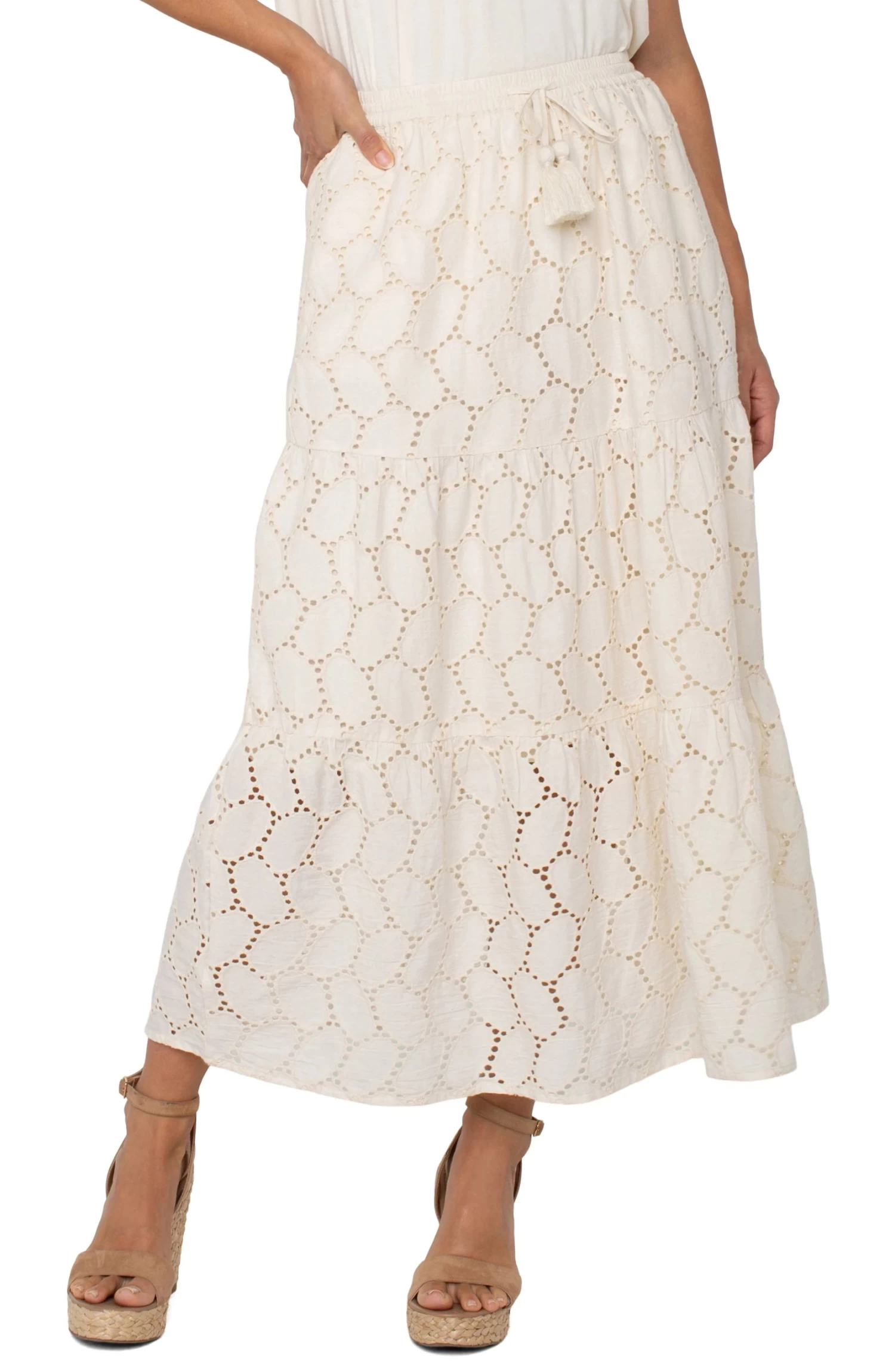 Breezy and beautiful, the Tiered Woven Maxi Skirt in Vanilla Eyelet by Liverpool is a warm-weather essential. Featuring a romantic eyelet design, tiered silhouette, and side seam pockets, this maxi skirt blends effortless style with everyday practicality. The soft, breathable fabric and versatile lining make it perfect for all-day wear, whether you’re headed to brunch, the beach, or a summer soirée. Pair it with a simple tank or blouse for an easy, feminine look.