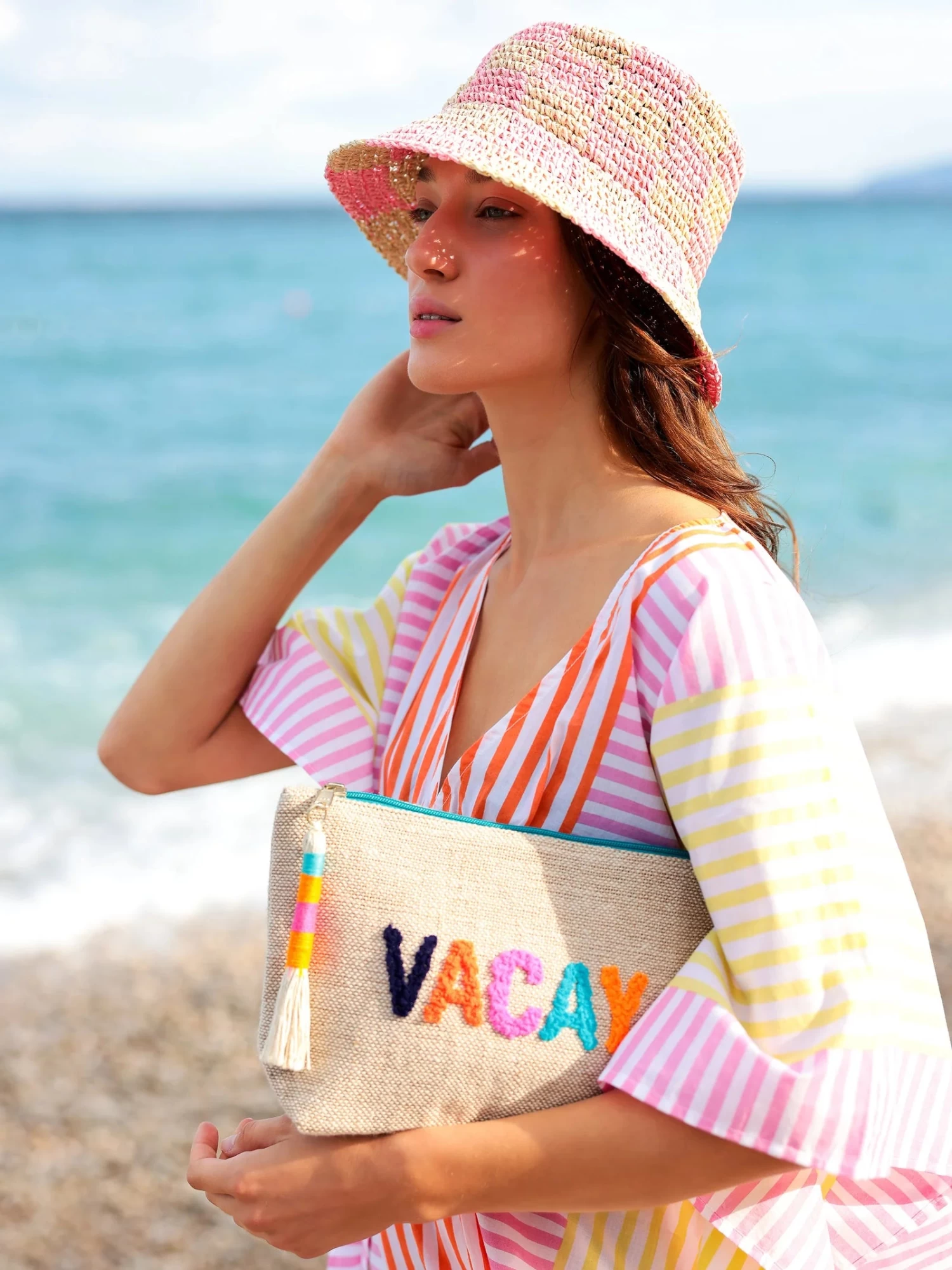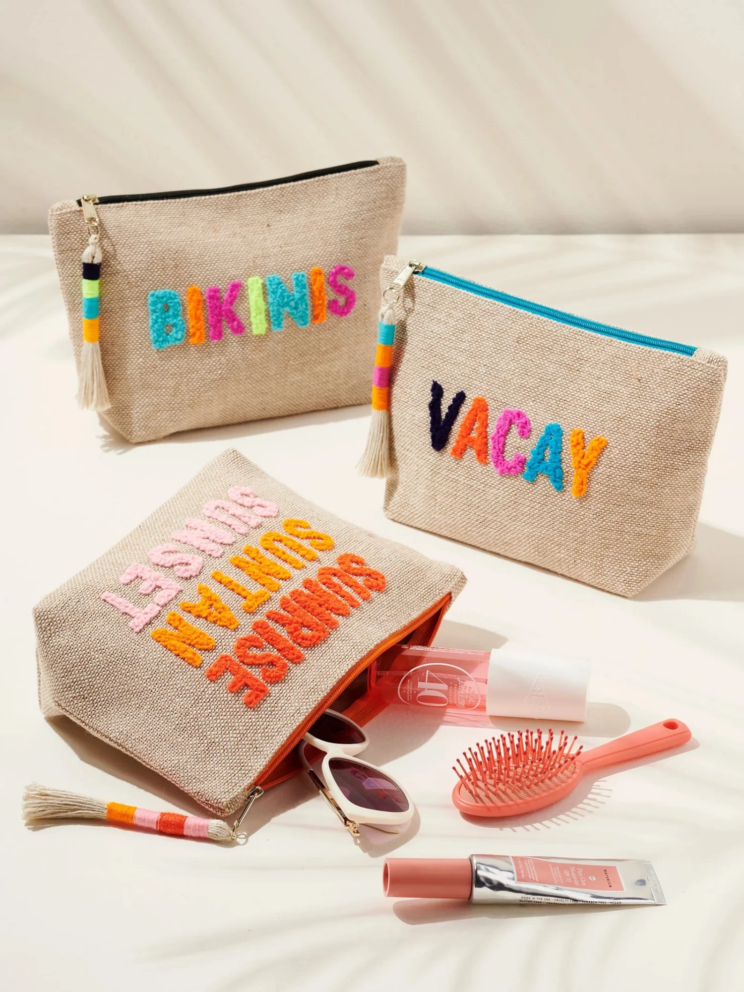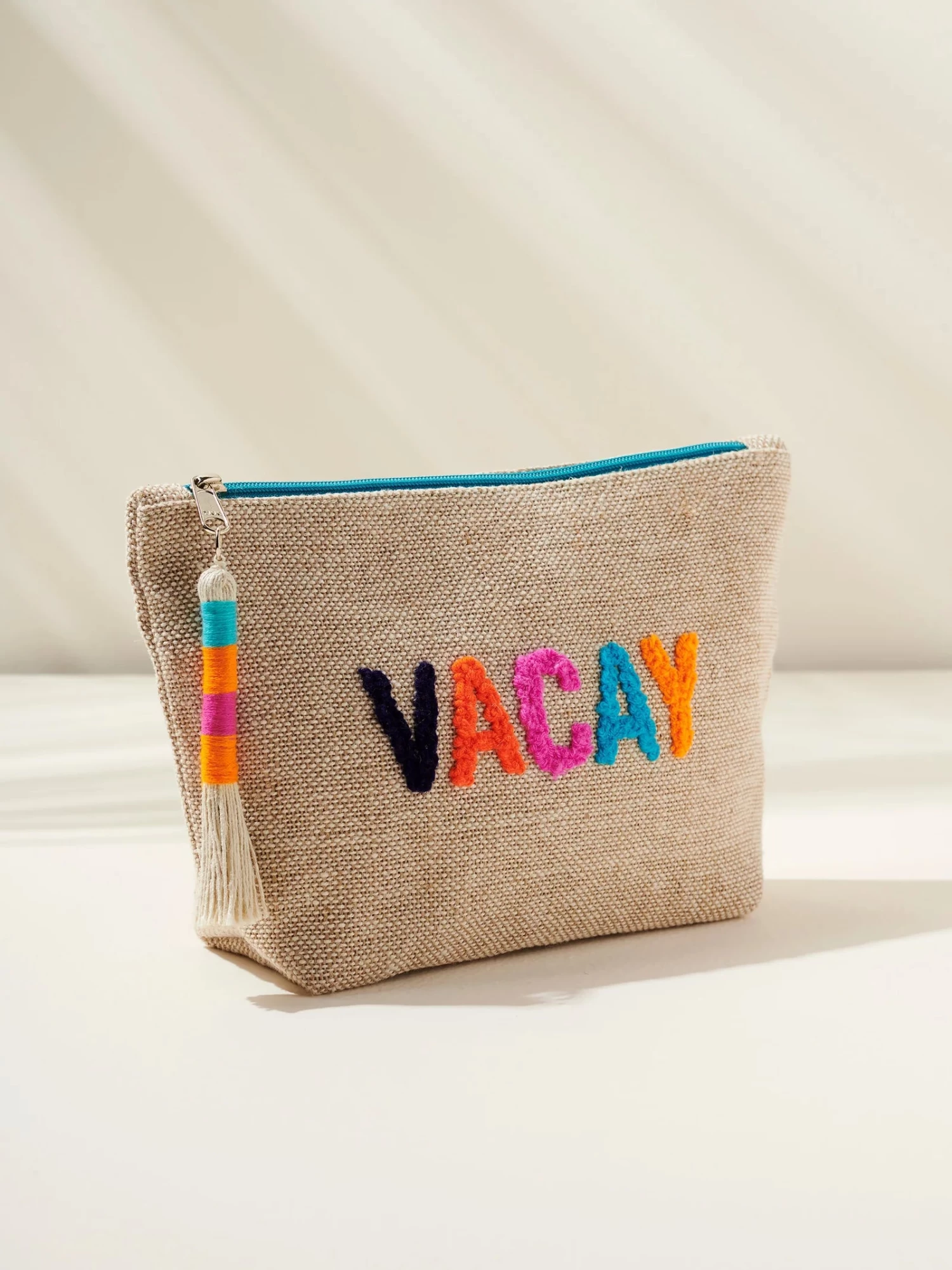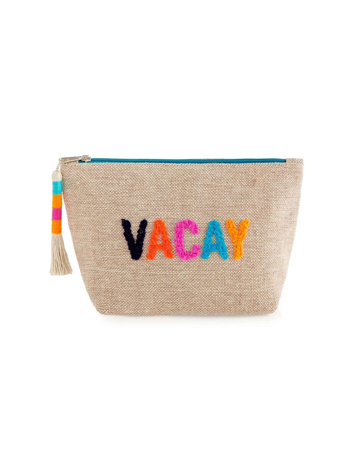 The “Vacay” Zip Pouch in Natural is the perfect travel companion for keeping your essentials stylishly organized. Made from natural jute with vibrant looped lettering that spells out “VACAY”, this pouch features a colorful tassel zipper pull and a spacious interior, ideal for sunscreen, lip balm, or whatever you need to make your vacation complete. Lightweight yet durable, it adds a fun, carefree touch to any getaway, whether tossed in your beach bag or carried solo for effortless style. The “Vacay” Zip Pouch is a must-have accessory for sunny adventures and travel in style!