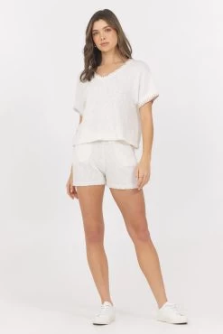 The White Summer Sand Sweater with Whipstitch is a perfect blend of elegance and comfort. Designed with a classic V-neck, this sweater offers a flattering silhouette while ensuring ease of wear. The whipstitch detailing adds a unique, textured finish, making it a standout piece for your wardrobe. Crafted with soft, breathable fabric, this versatile white sweater is perfect for both casual and dressed-up looks. Whether you’re layering it over your favorite blouse or wearing it solo, the Summer Sand sweater will elevate your style with a chic, modern touch.