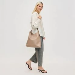 Introducing the Zelda Tote in Taupe, your new minimalist must-have. Made with smooth vegan leather and a chic, understated design, this hobo exudes elegance. The magnetic snap closure and gold hardware add to its sleek and stylish look, while the adjustable strap provides versatility for any occasion. With an unlined interior and attached zip pouch, this beauty offers effortless organization and proves that less is truly more.