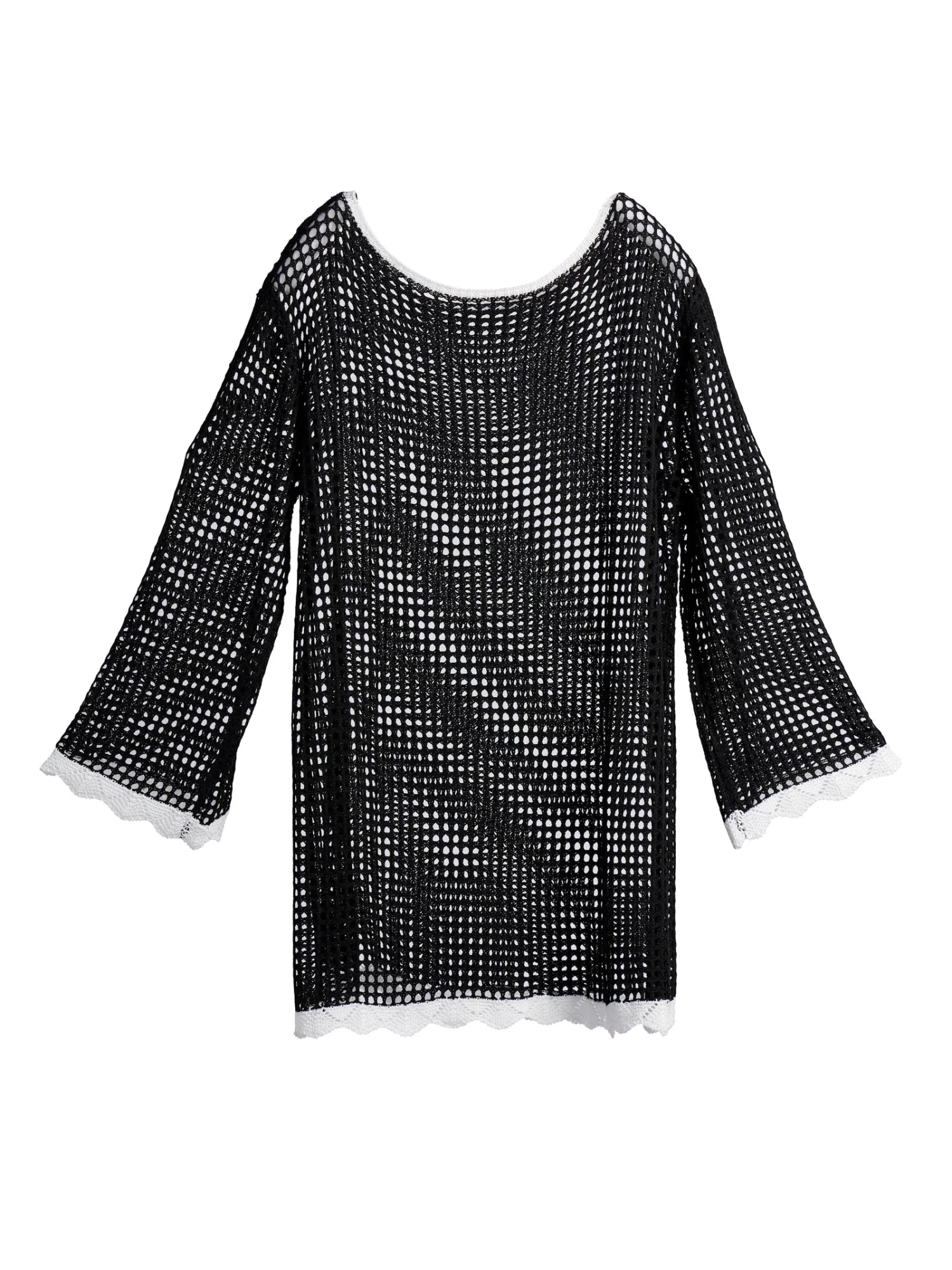 Make a splash in the chic Zuma Cover-Up in Black! Designed with a playful open-knit texture, this breezy cover-up adds the perfect pop of sophistication to your poolside or beach look. Featuring fun scalloped edges and a relaxed fit, it’s the ideal piece for effortlessly stylish, sun-soaked days. Whether you’re lounging by the water or grabbing a quick drink, the Zuma Cover-Up in black adds a touch of elegance to your swimwear!